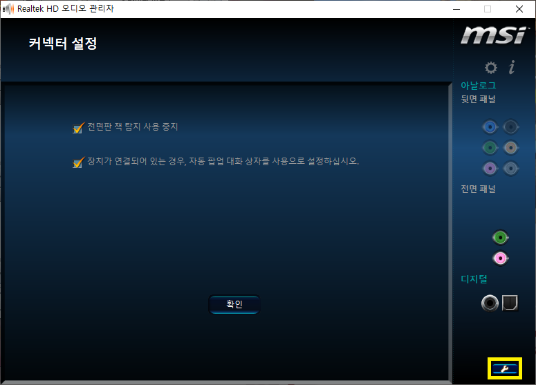 '전면 패널 잭 팝업 대화상자 사용 안함' 을 켜고