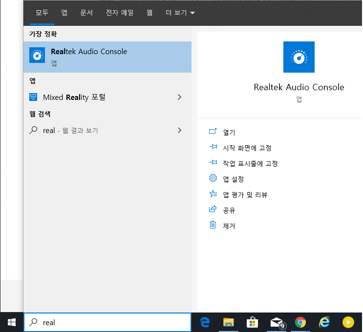 시작메뉴의 검색에 Realtek Audio Console 을 검색하여 실행합니다