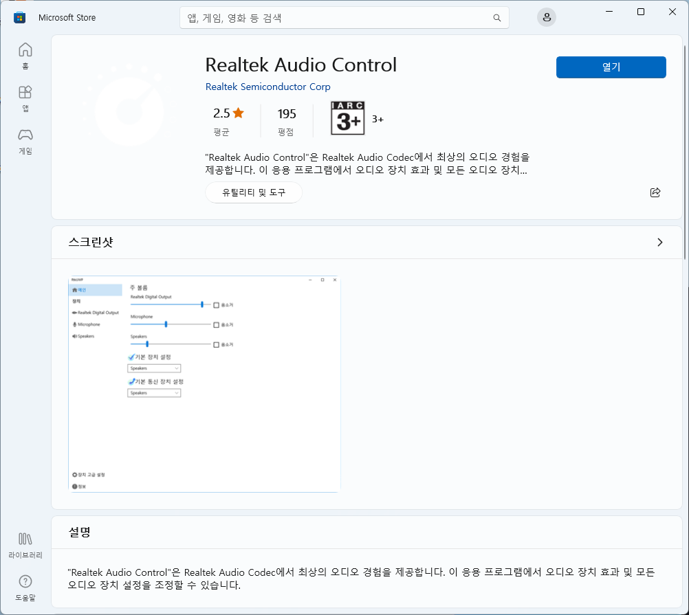 아래 스크린 샷과 같이 Realtek Audio Control 을 검색하여 설치합니다