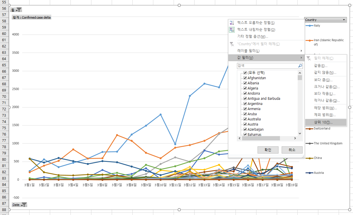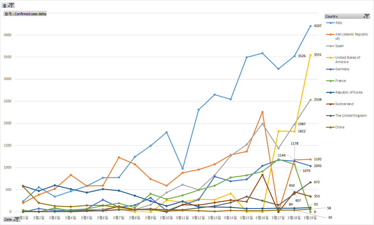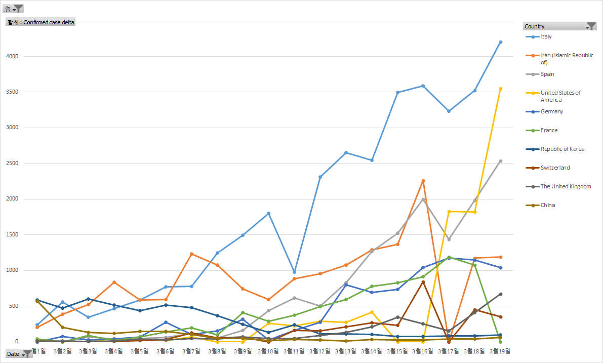 가장 큰 수치의 이태리 그래프를 보면 이상하게 그래프 중간에 색깔도 바뀌고 이상하네요