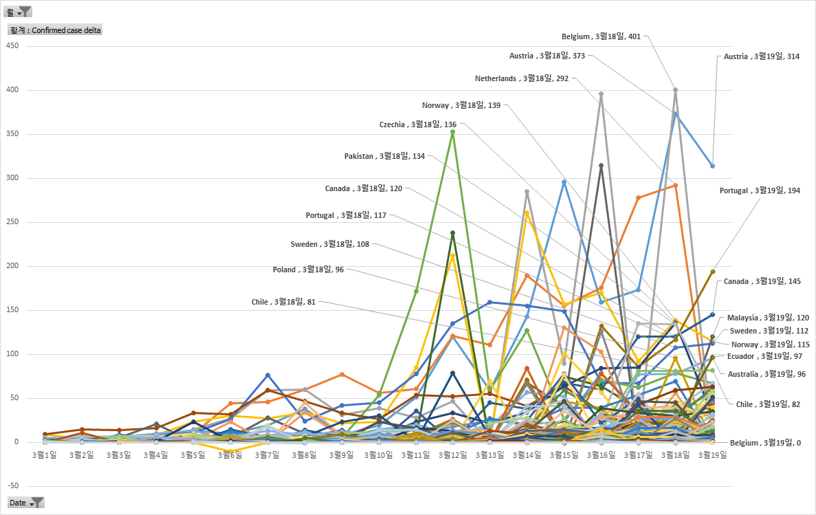 '세계 코로나(COVID-19) 환자수 추세분석'을 작성하다보니
