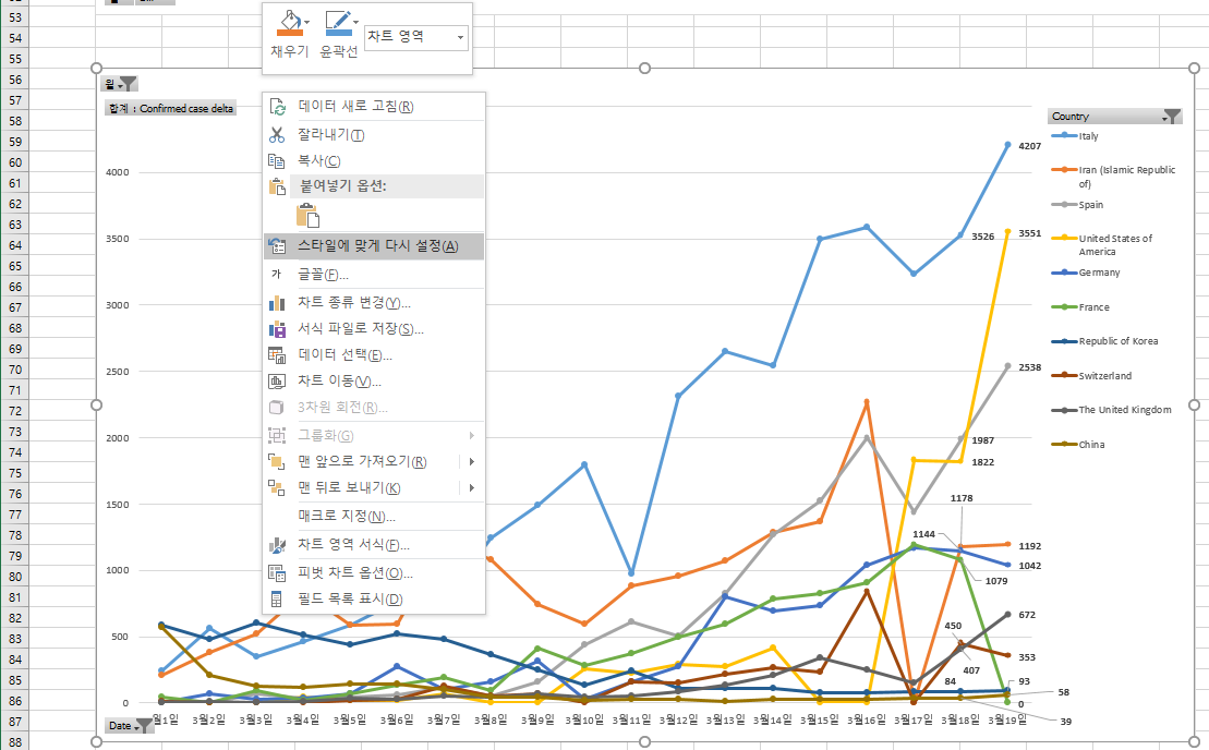 이렇게 그래프가 살짝 마음에 안 들때 아래 화면의 '스타일에 맞게 다시 설정'을 눌러주면 정리가 됩니다