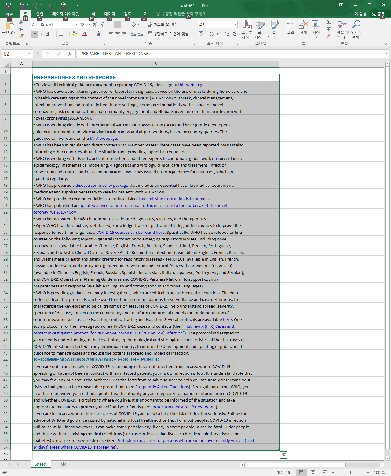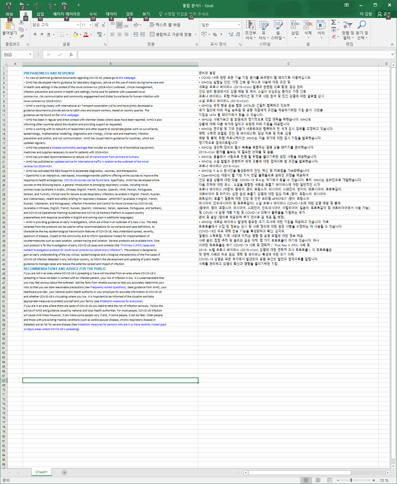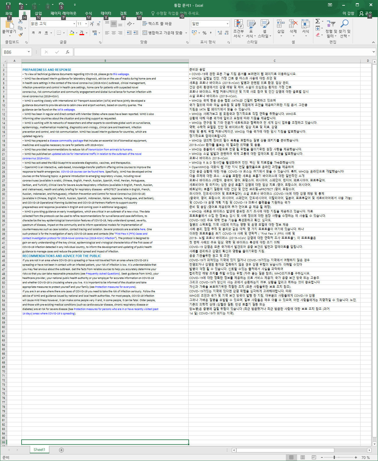 1. 우선 Excel 에 번역할 문서의 내용을 붙여 넣습니다
