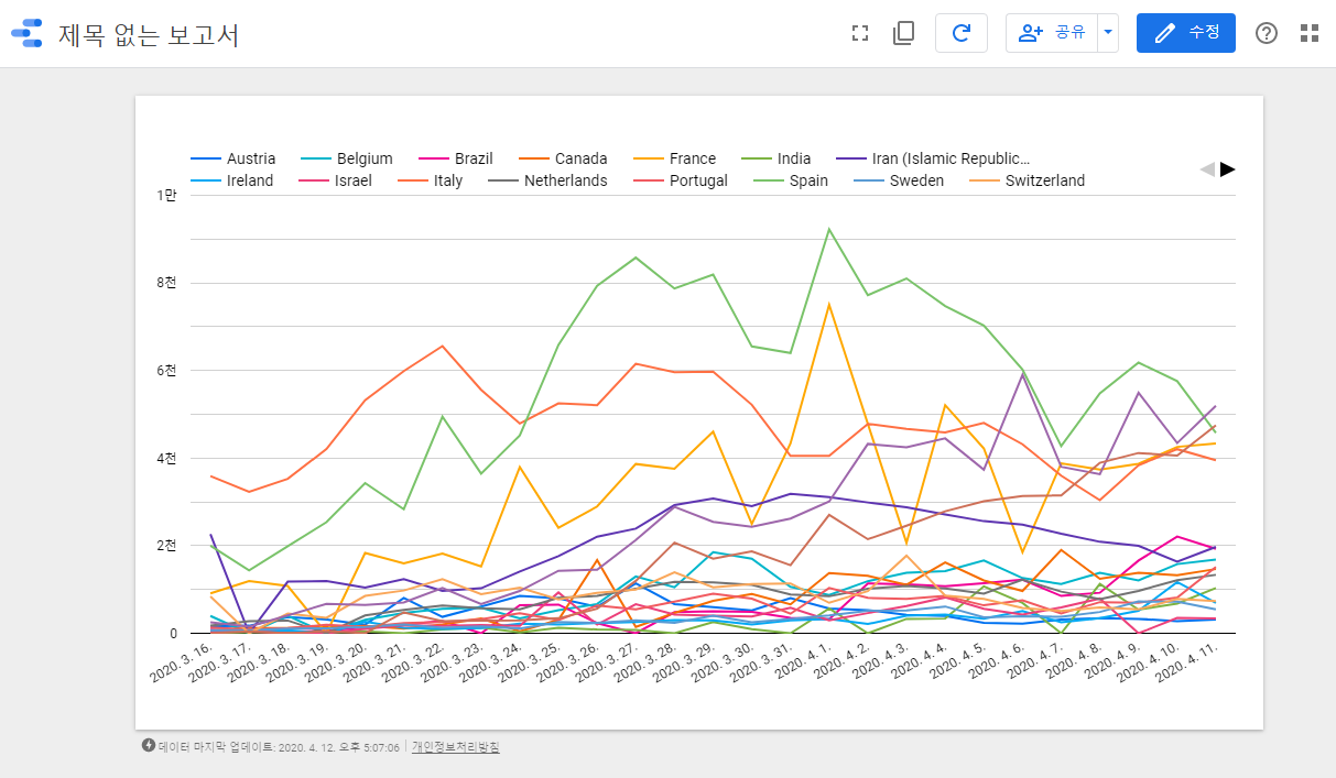 Google 스프레드시트에 올려 놓은 코로나 세계Chart 파일이 보입니다