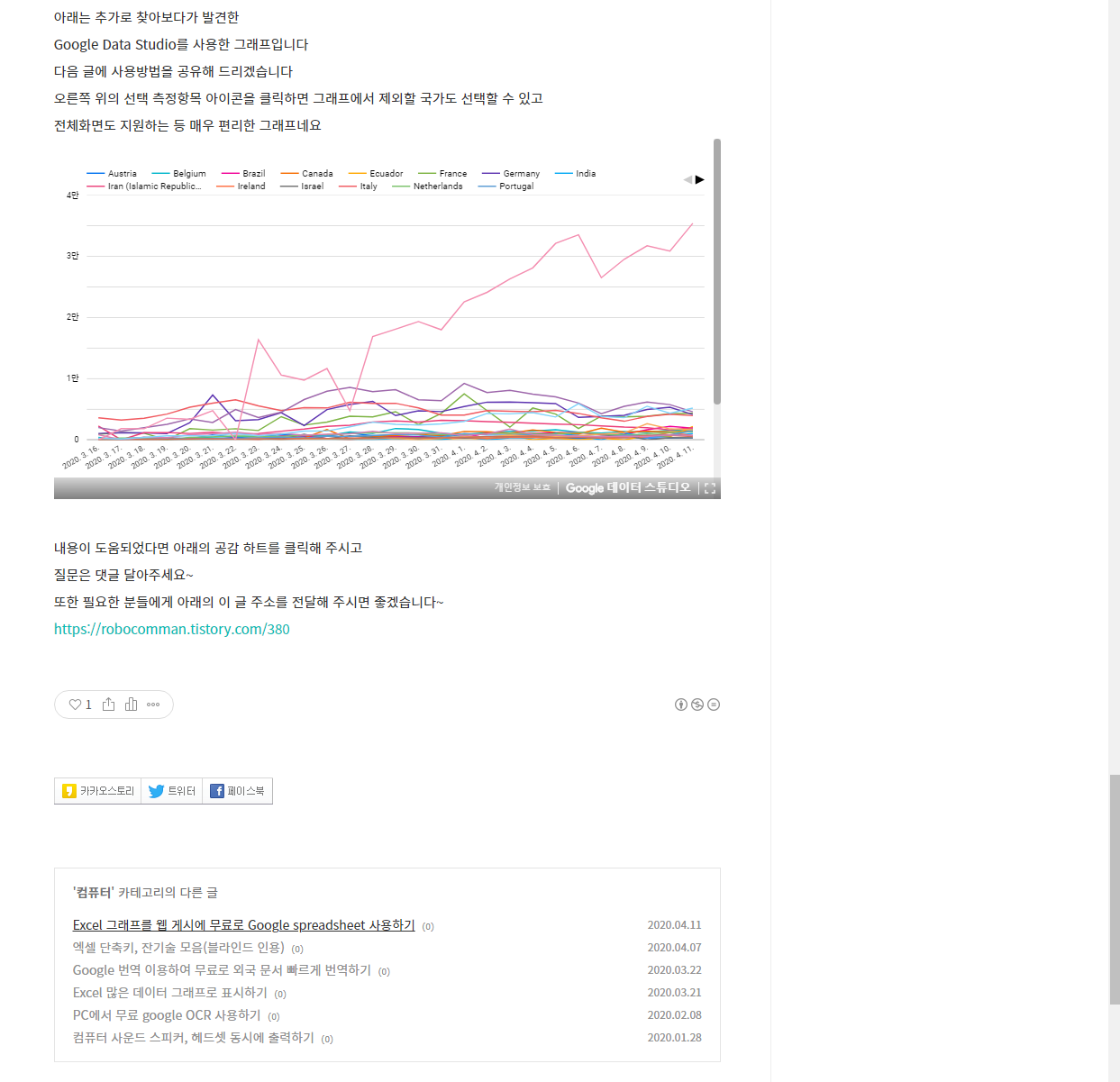 | 엑셀(Excel) 그래프 웹 게시에 무료 Google spreadsheet 사용하기 (0) | 2020.04.11 |