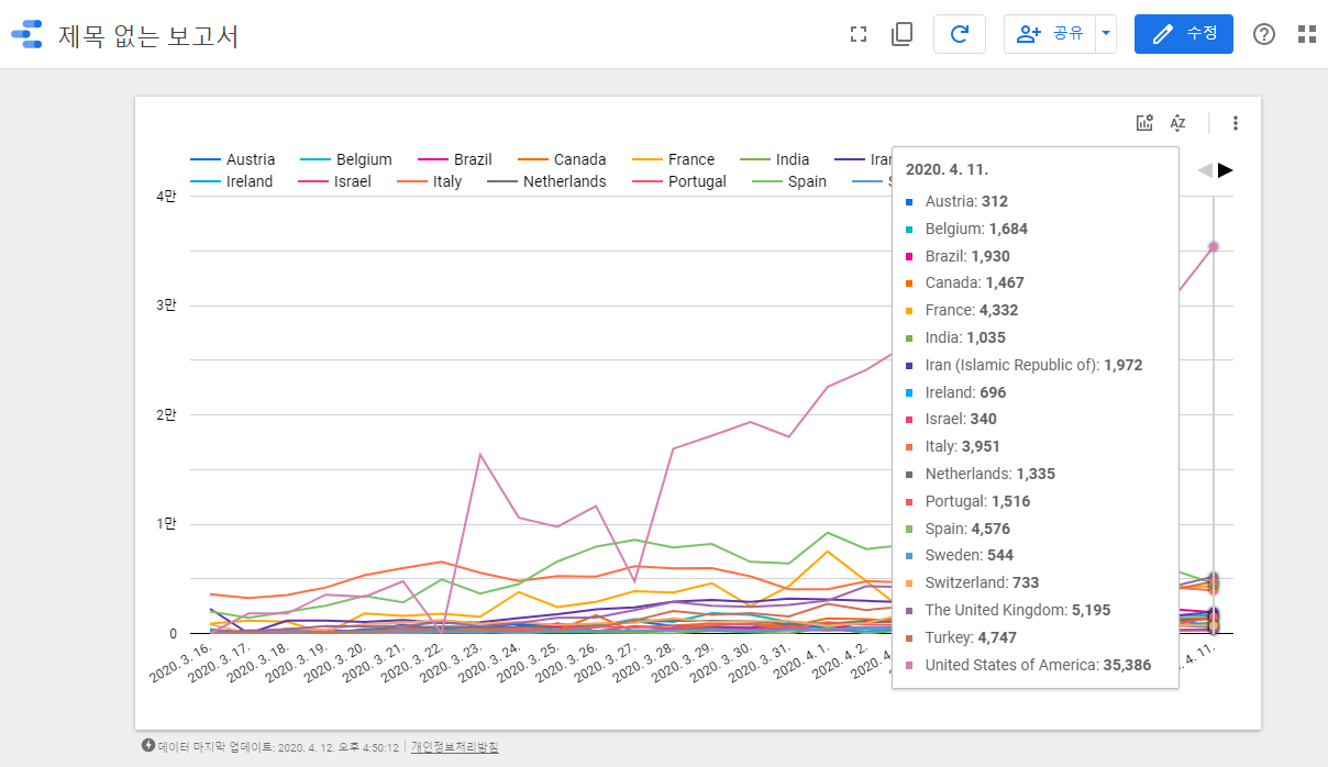 Google 스프레드시트에 올려 놓은 코로나 세계Chart 파일이 보입니다
