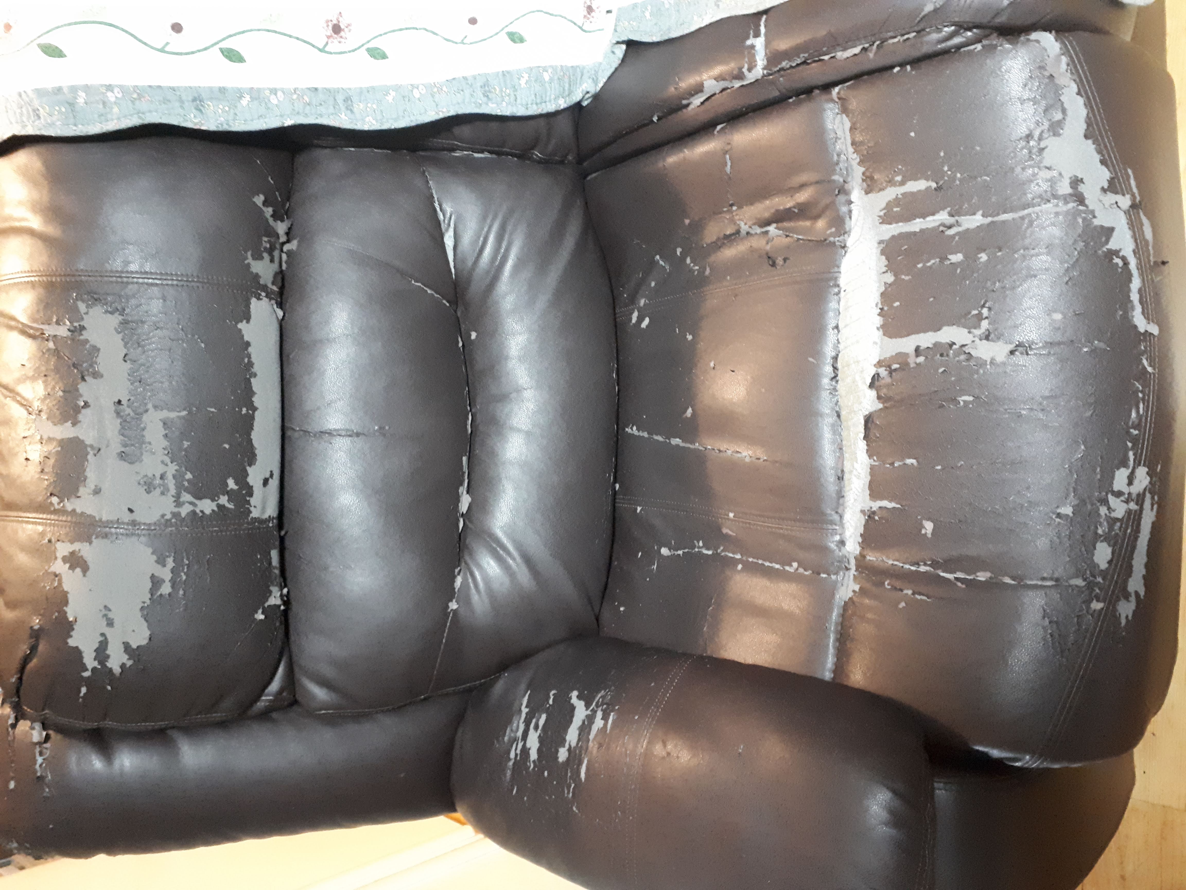 이전의 저렴한 인조가죽 소파에서의 표면이 떨어져 나오면서 부스러지는 현상은