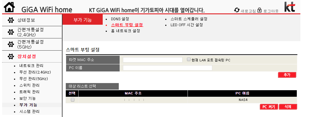 '스마트 부팅 설정' 메뉴에서 '타겟 MAC 주소'를 입력하면 됩니다