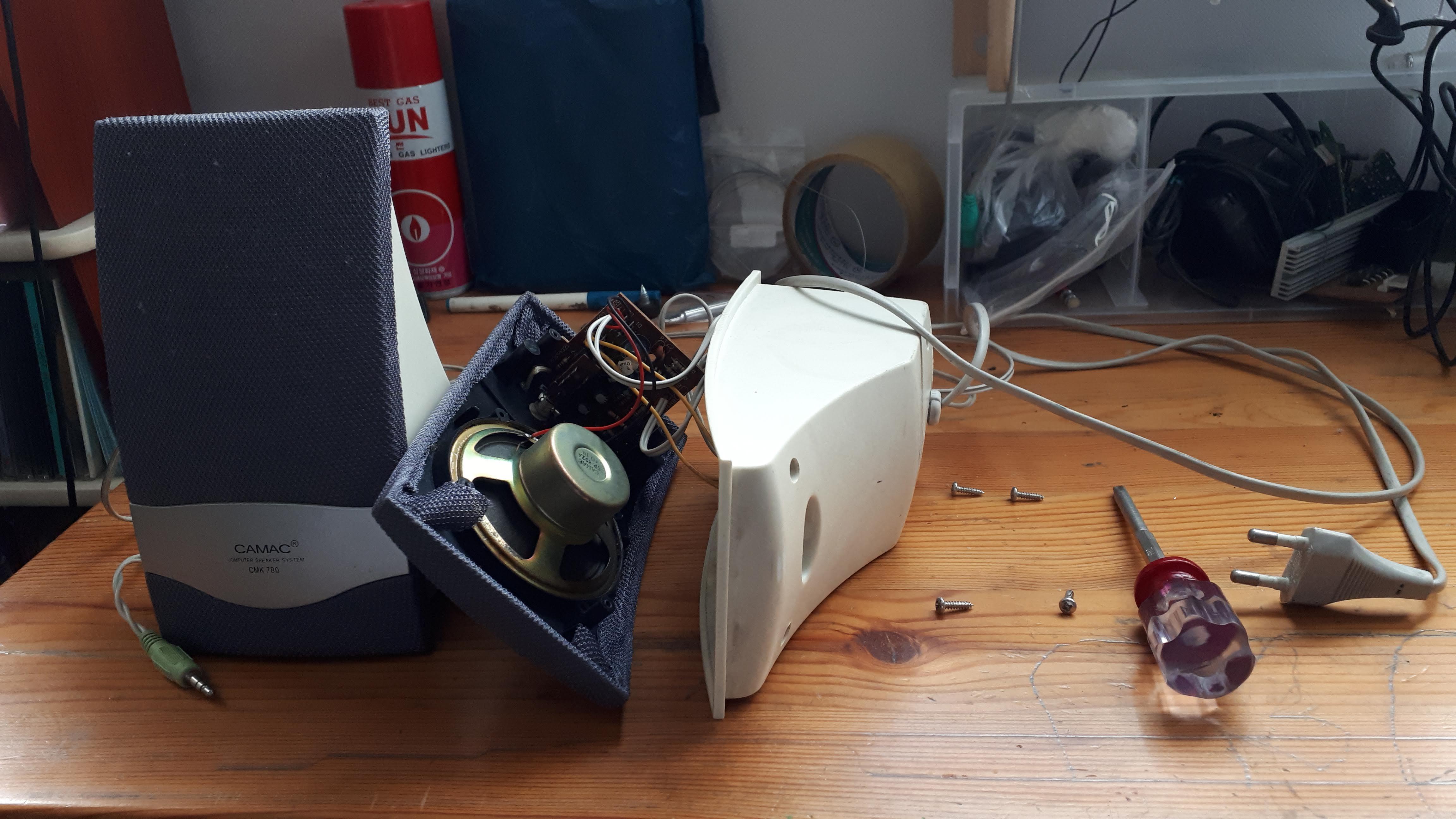 컴퓨터 스피커에서 주로 발생하는 고장인 볼륨조절기는 이미 제거해 두었고