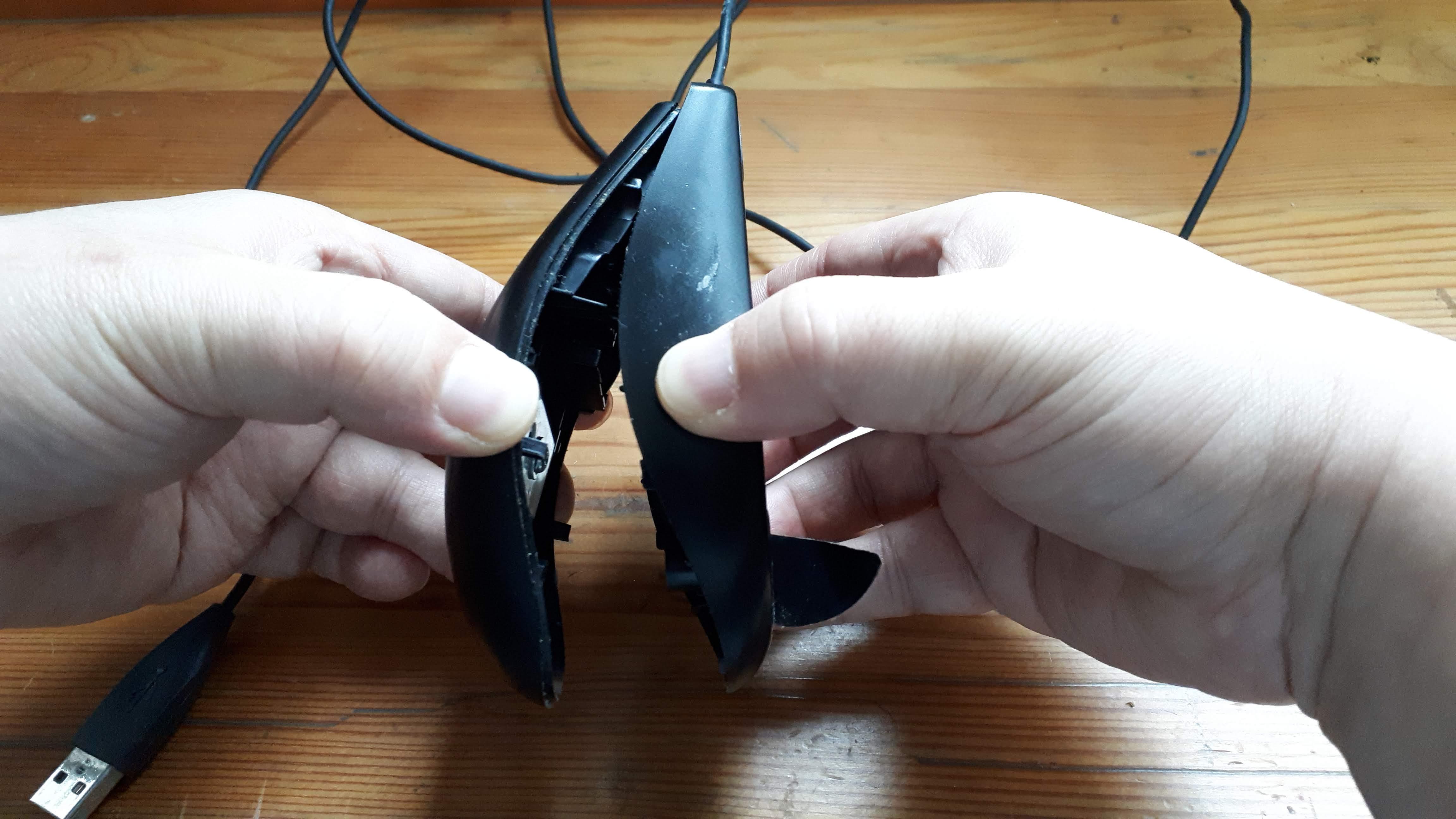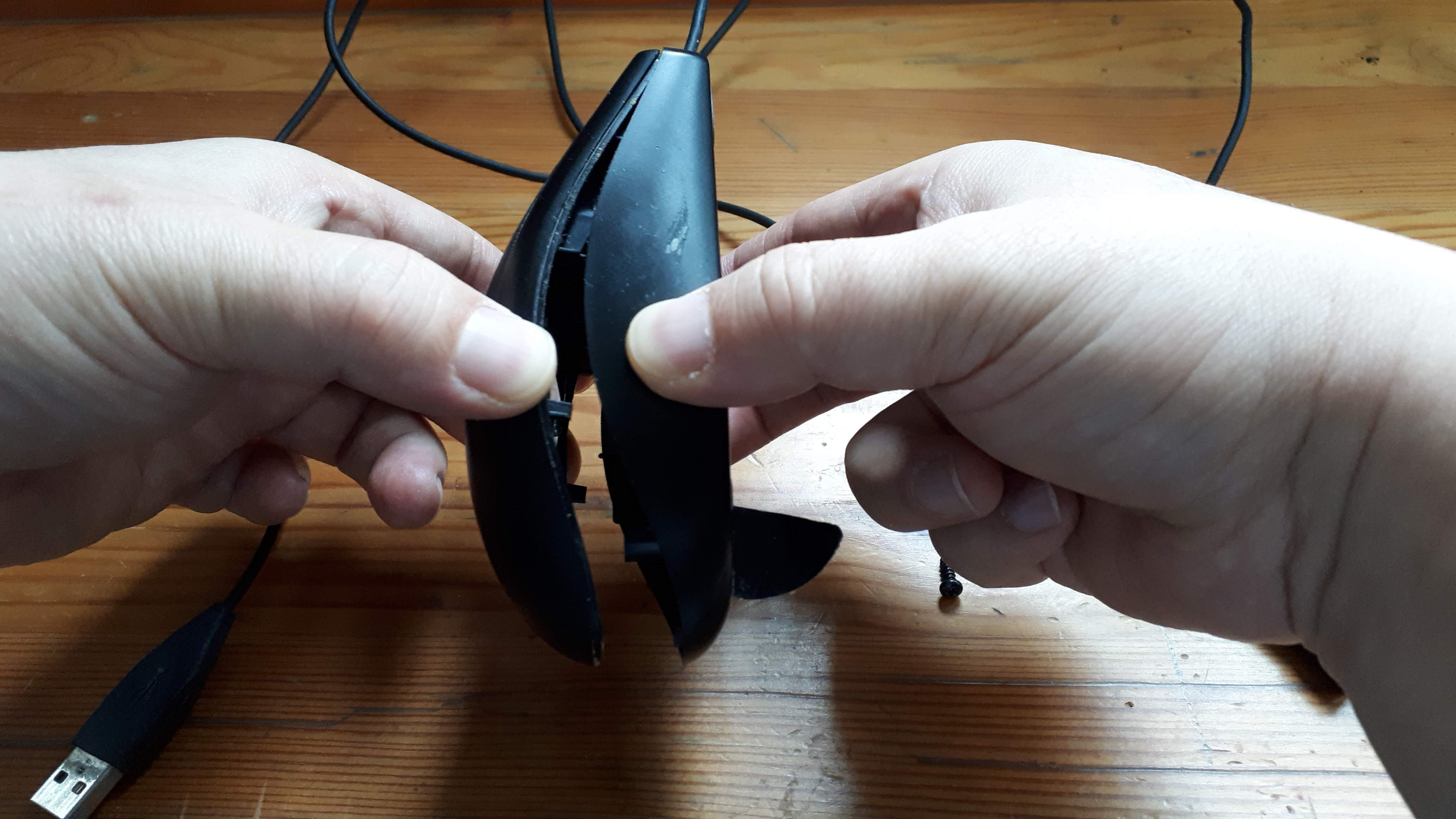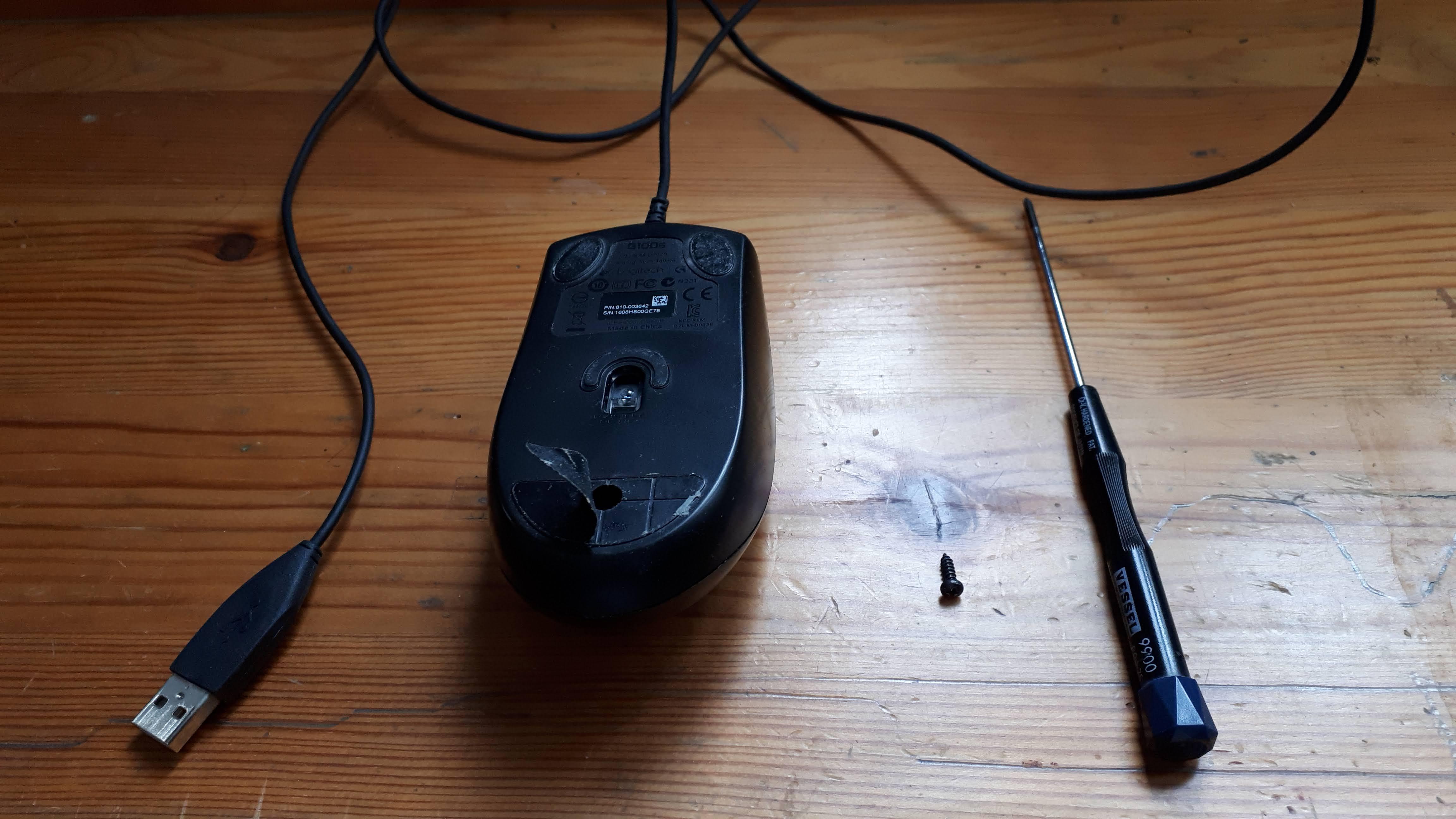 로지텍 G100s 는 하단의 마우스 서퍼를 떼고 중간쯤에 위치한 나사 하나만 풀면 됩니다