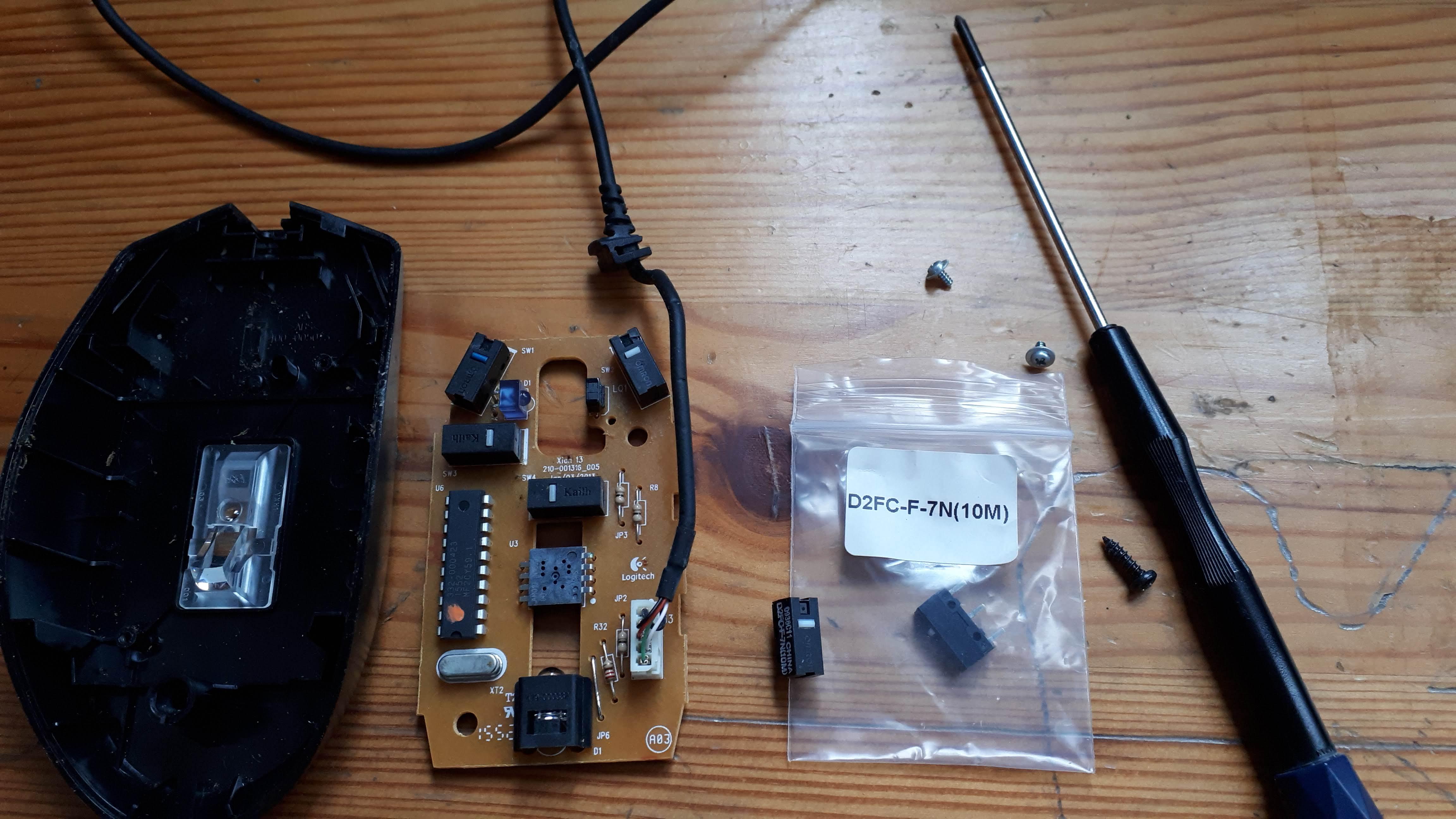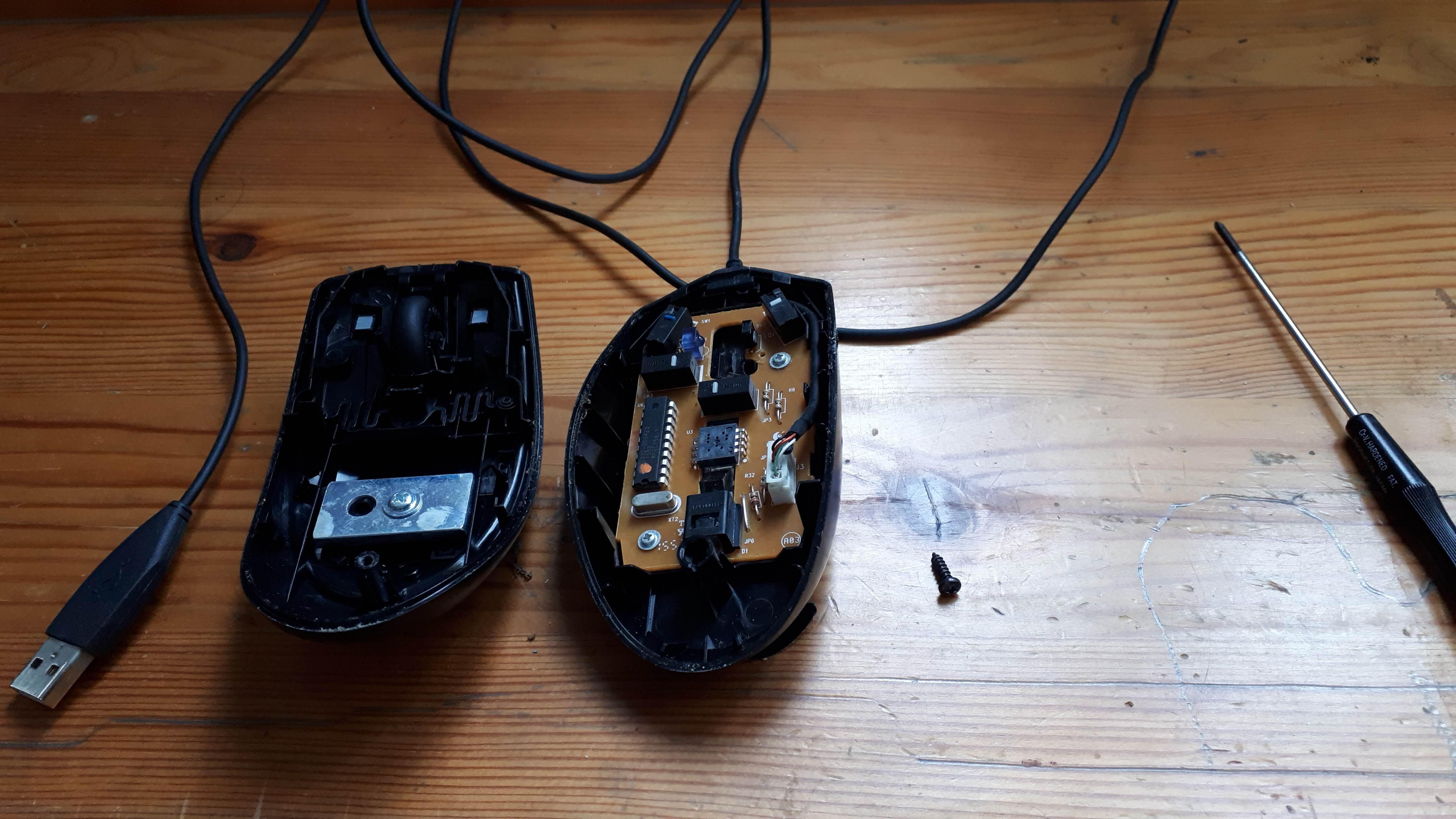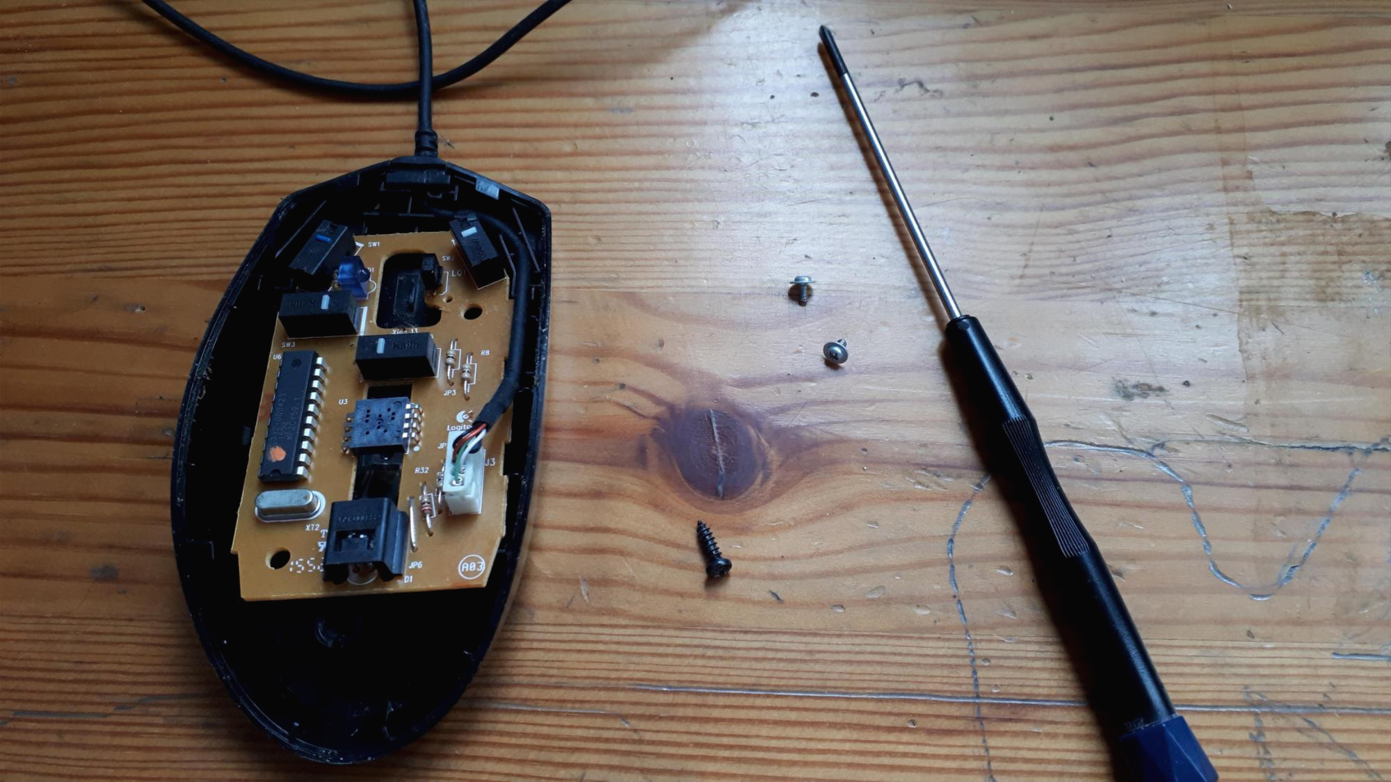 로지텍 G100s 는 하단의 마우스 서퍼를 떼고 중간쯤에 위치한 나사 하나만 풀면 됩니다