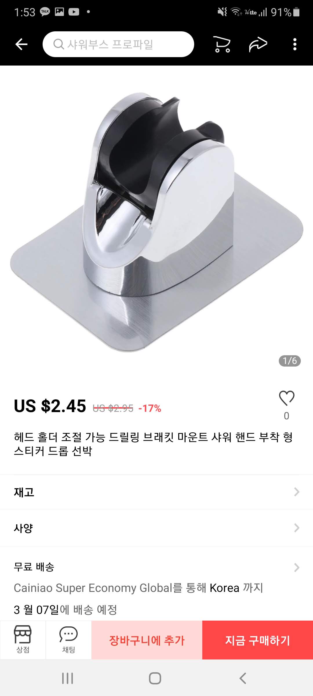 접착식 각도조절 샤위기 걸이는 1540원이 최저가이고 배송비는 추가로 2500원입니다