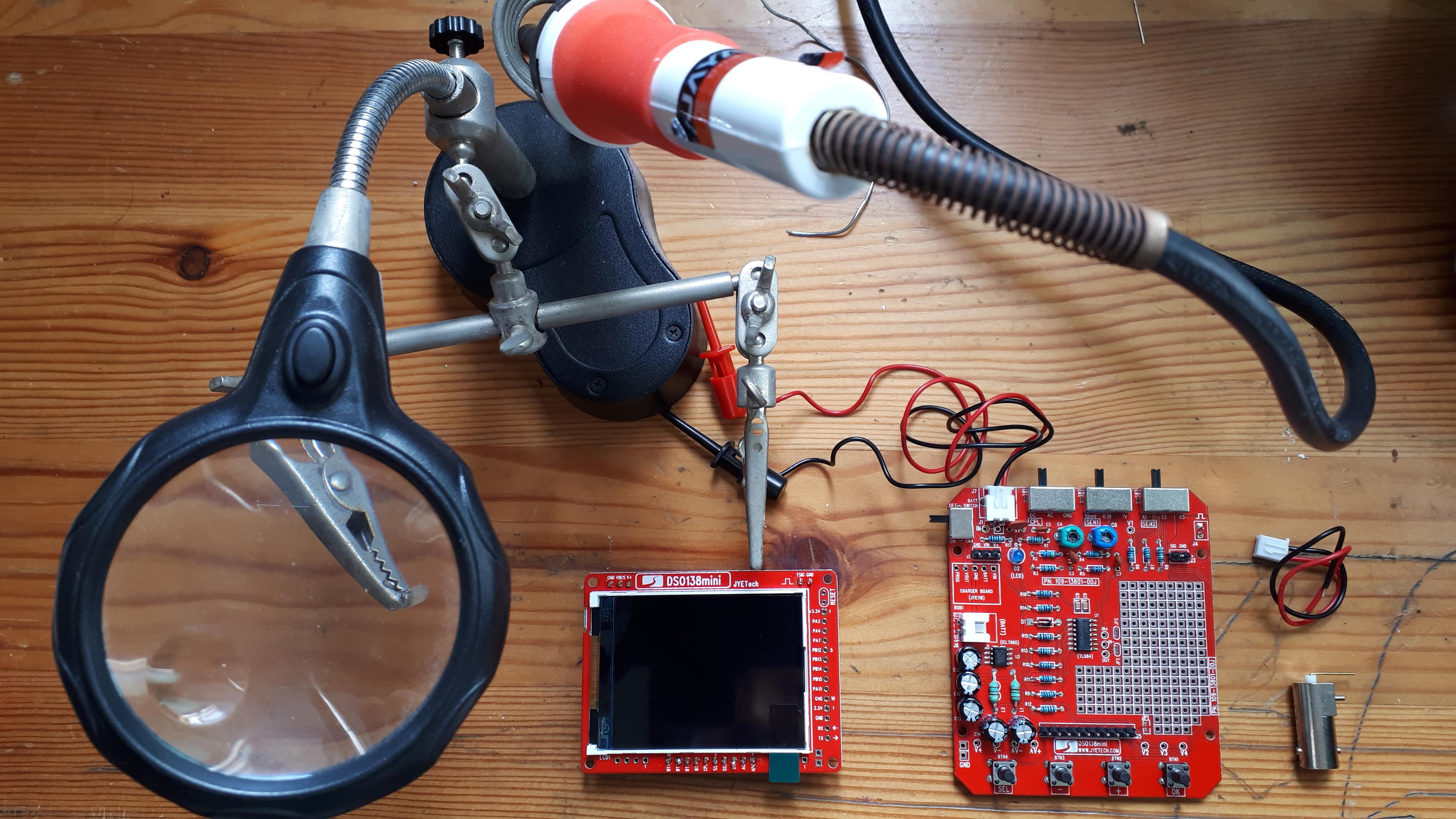 8$ 정도에 구입할 수 있는 인두 및 PCB 거치대 겸 돋보기(허접한 LED 조명 내장)가 조립에 도움이 되었습니다