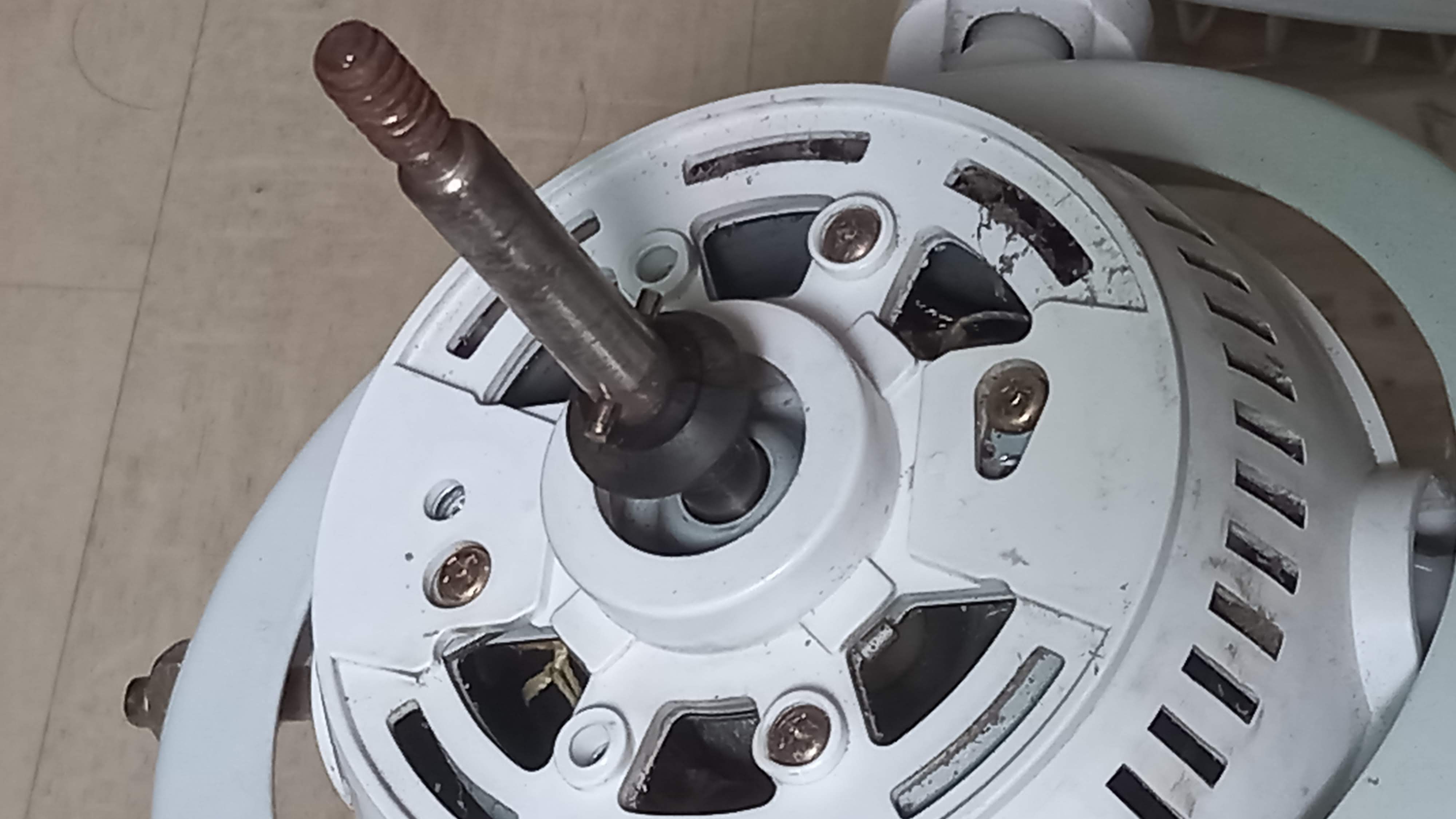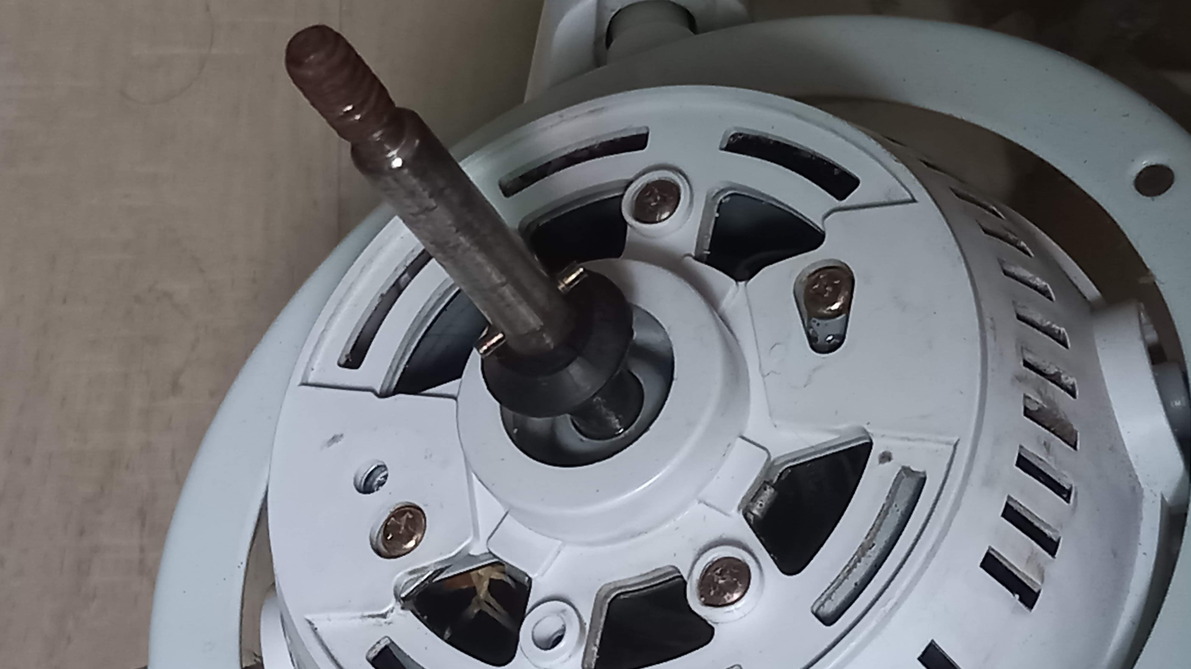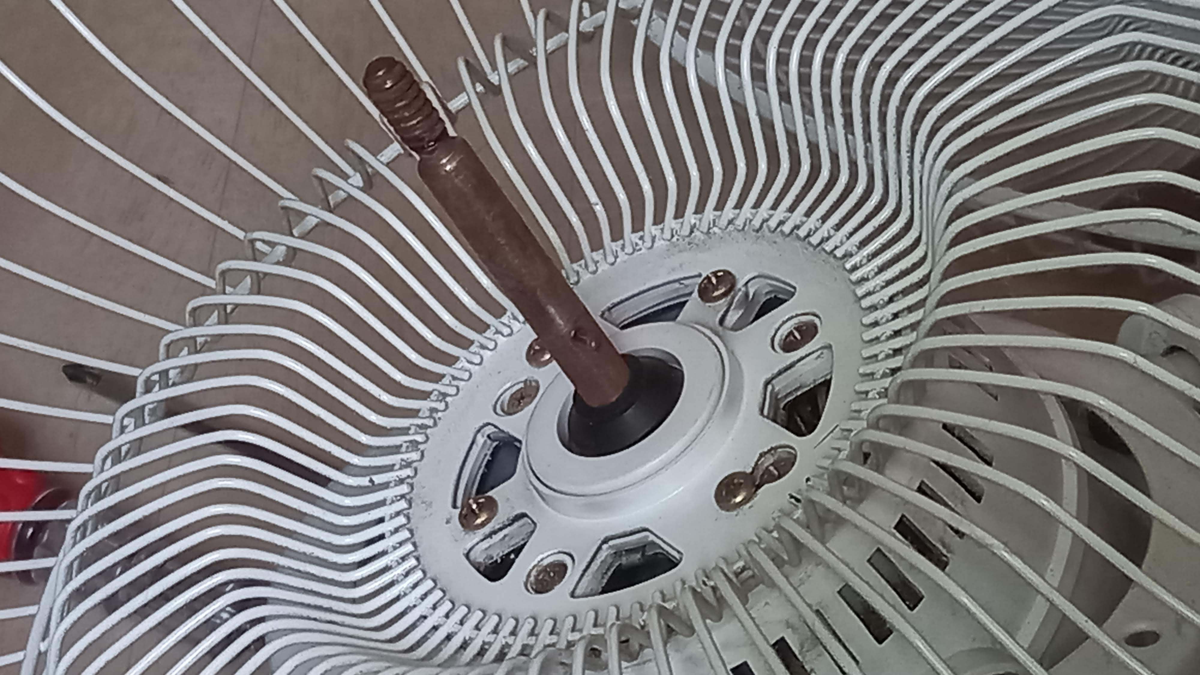 보호망과 선풍기 날개를 제거하니 모터축에 녹이 좀 보입니다