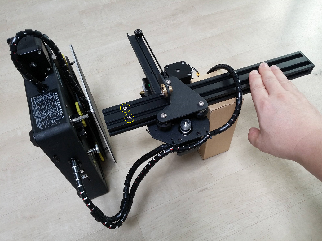 본체에 걸쳐진 Z축을 빼낸 상태에서 Z축 나사용 볼트를 체결될 위치쯤(노랑색 원)에 삽입합니다