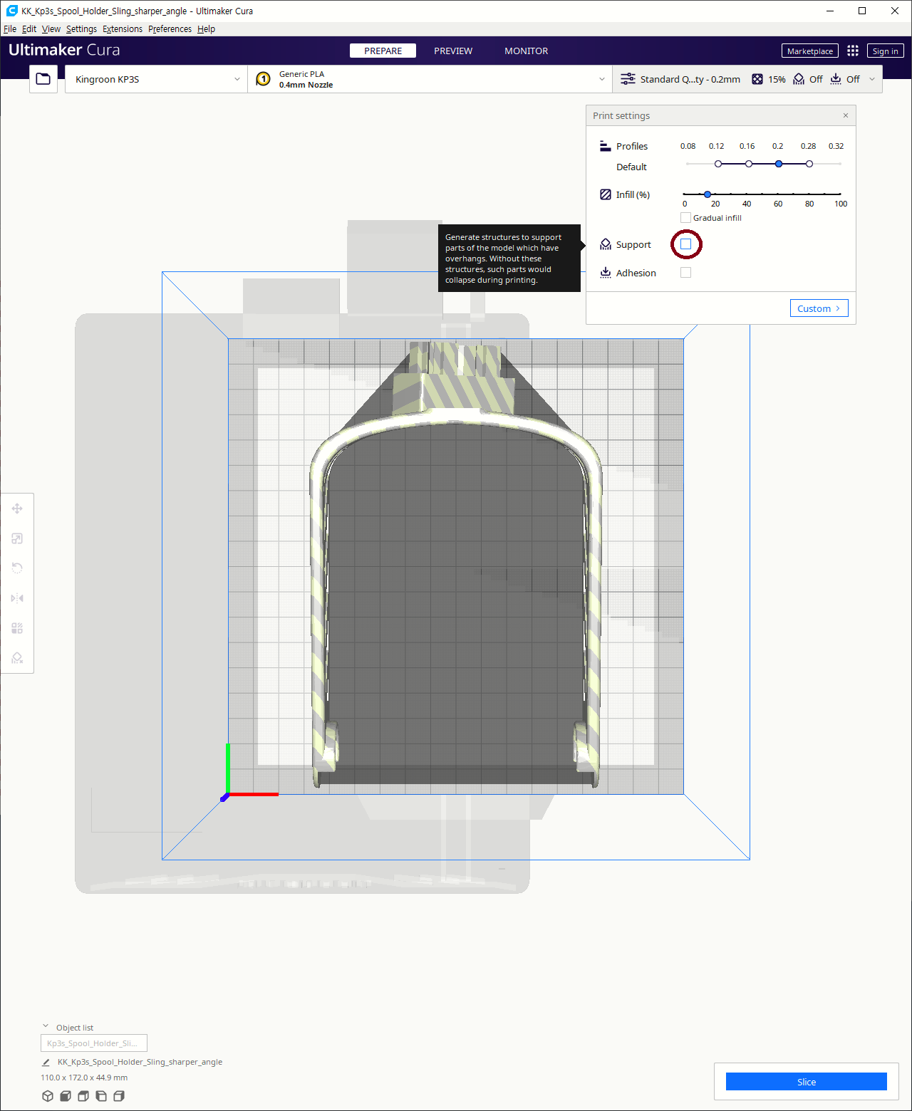 KP3S 의 출력범위인 18x18x18cm 안쪽임에도 Slice 가 되지 않아서