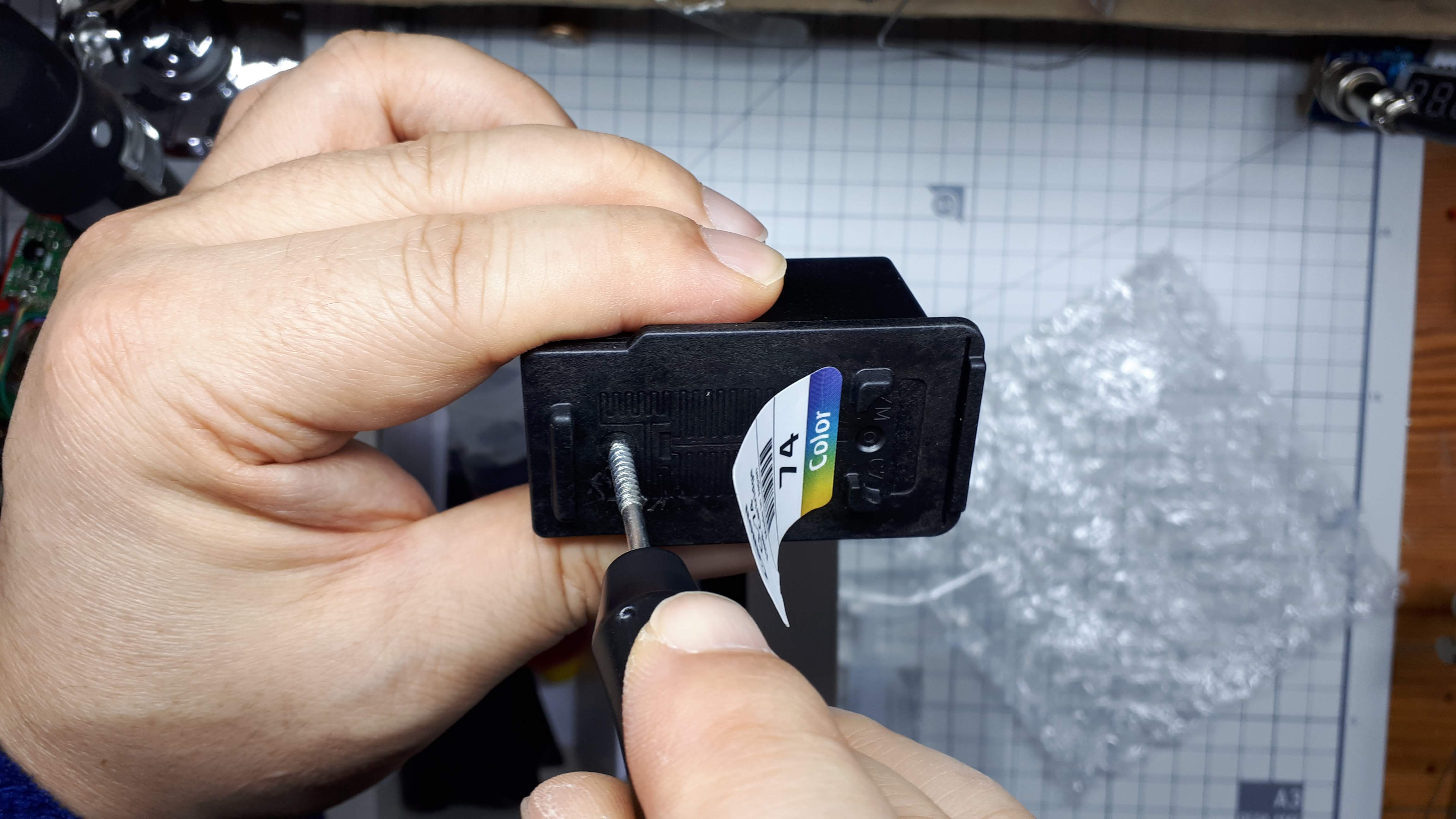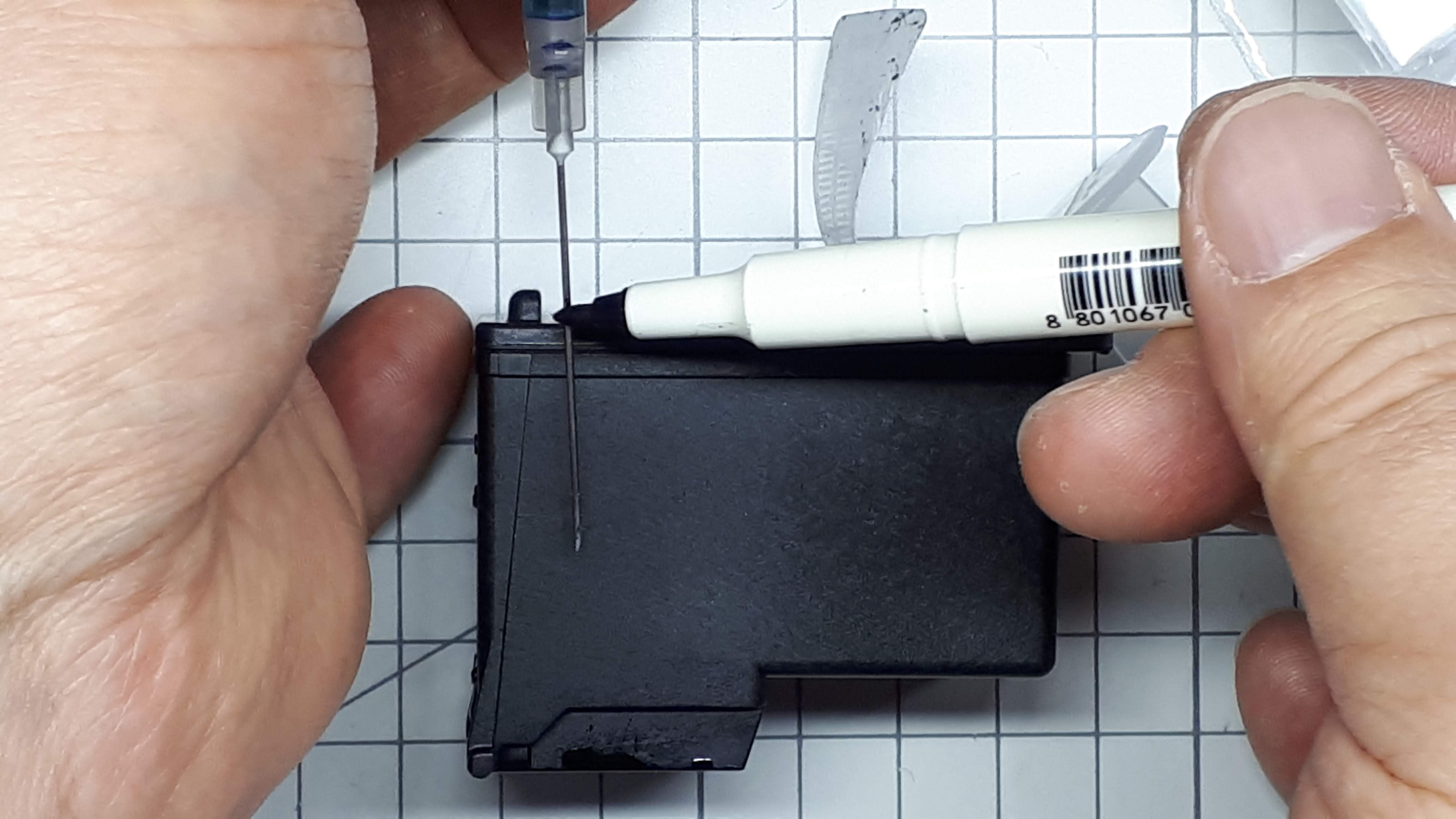 공기구멍에 잉크 주입용 주사기 바늘이 들어갈 수 있도록 넓혀줍니다