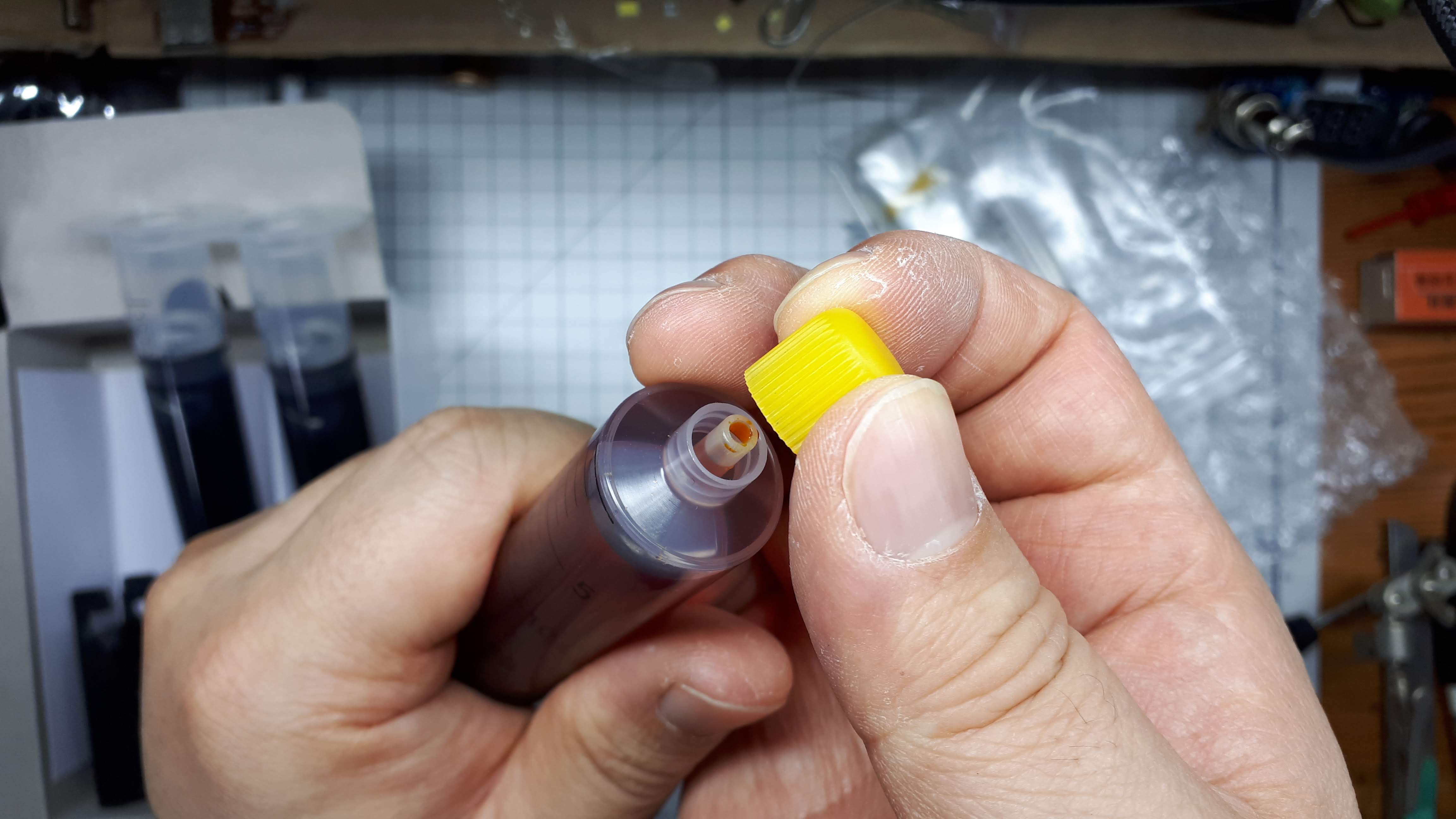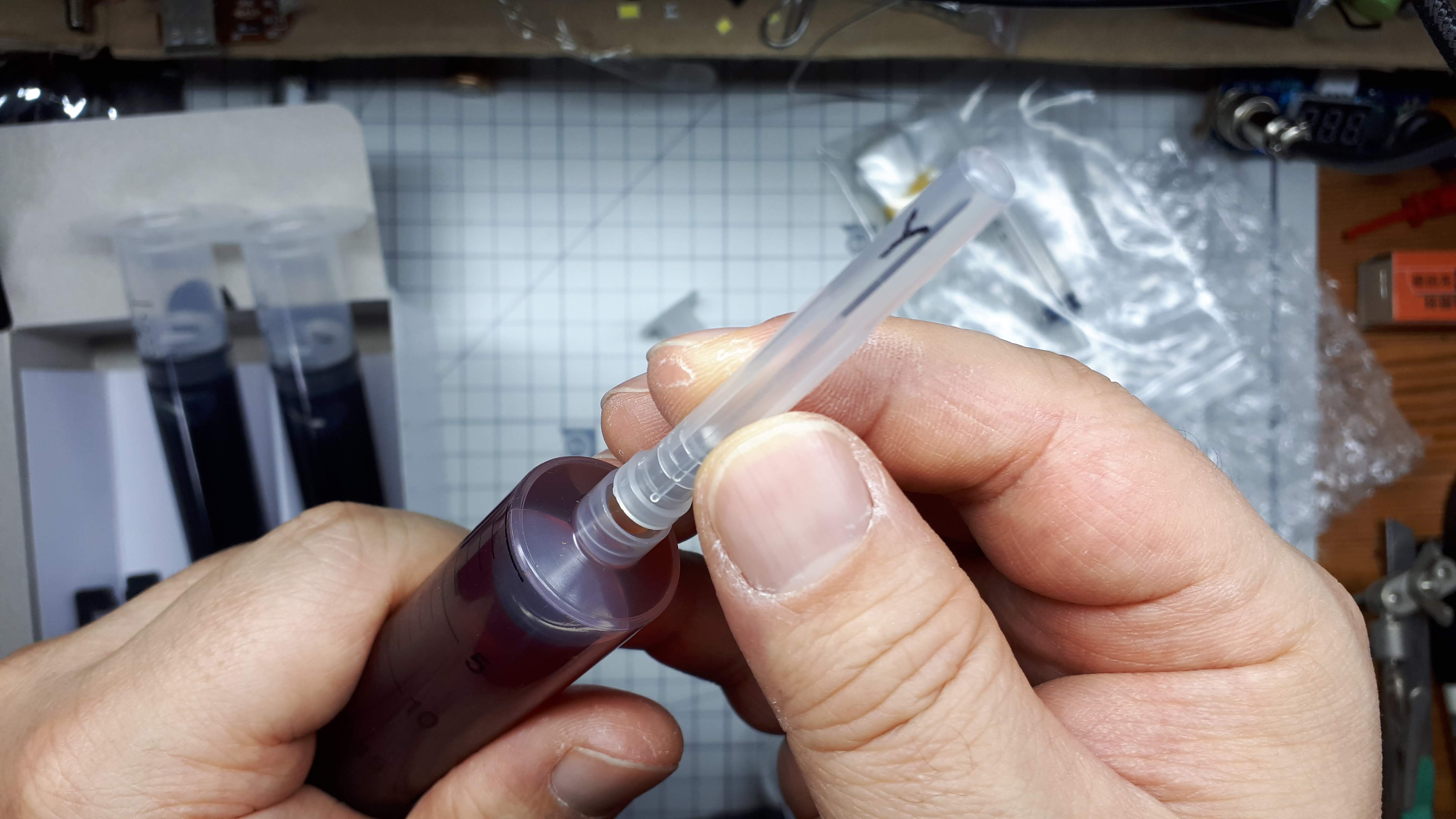 이제 잉크를 주입할 준비가 되었으니 잉크주사기에 주사바늘을 결합해야 합니다