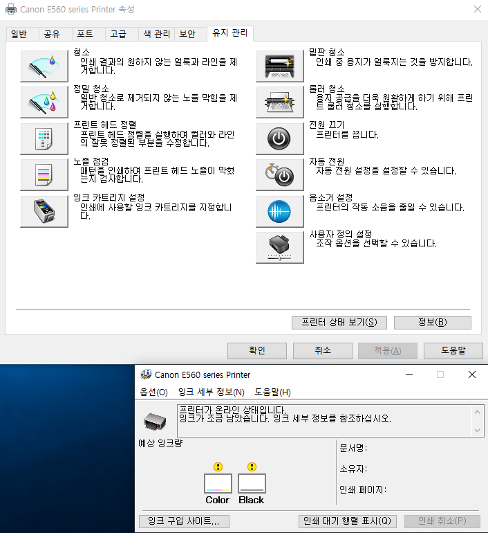 프린터 상태 보기를 눌러보니 아래와 같이 잉크량 부족으로 표시됩니다