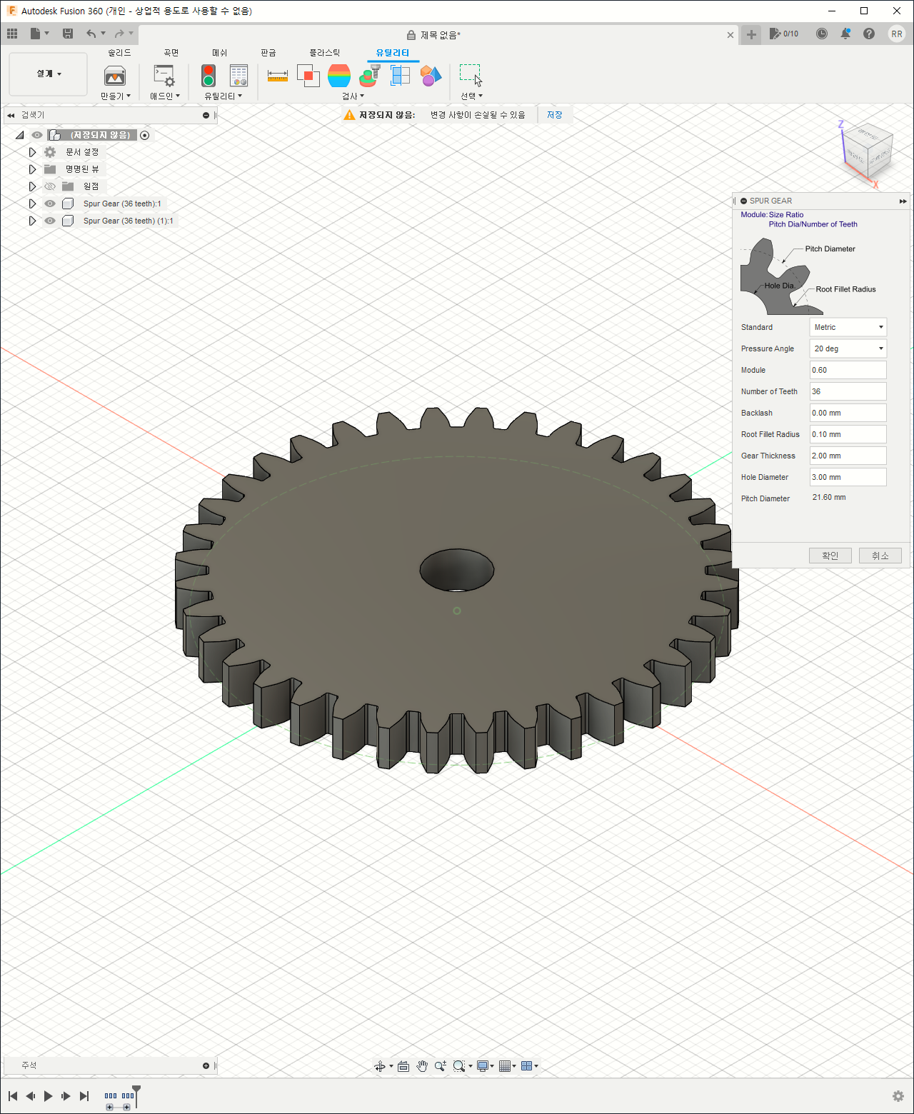 Autodesk사의 Fusion 360을 사용하면 기어 모델을 매우 쉽게 그릴 수 있습니다