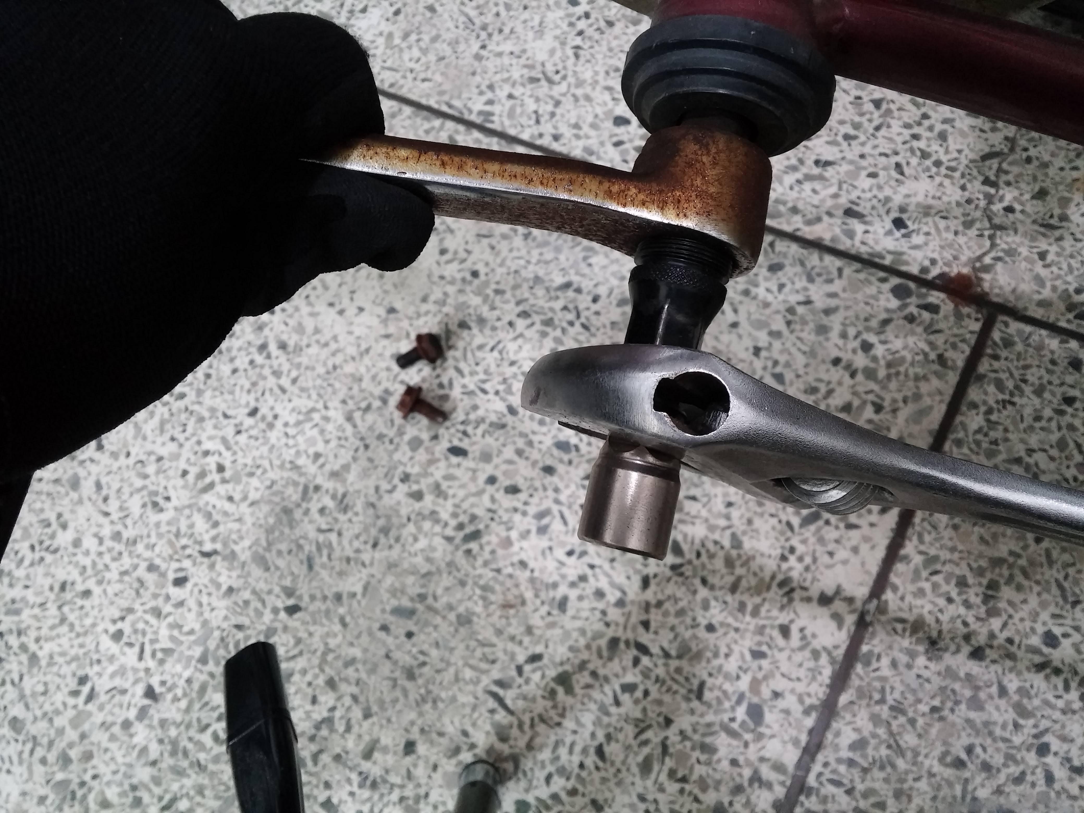 10년 넘게 사용하여 크랭크암이 고착된 페달축(BB)을 수리한 것과