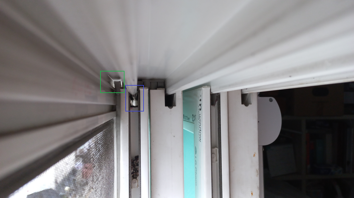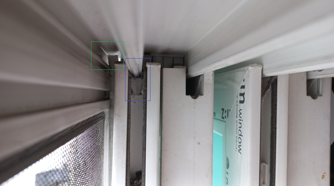 파란색 네모 표시 부분은 창문틀과 창틀 사이에 빛이 들어오고 있어서 모기가 들어올 통로가 될 것 같습니다