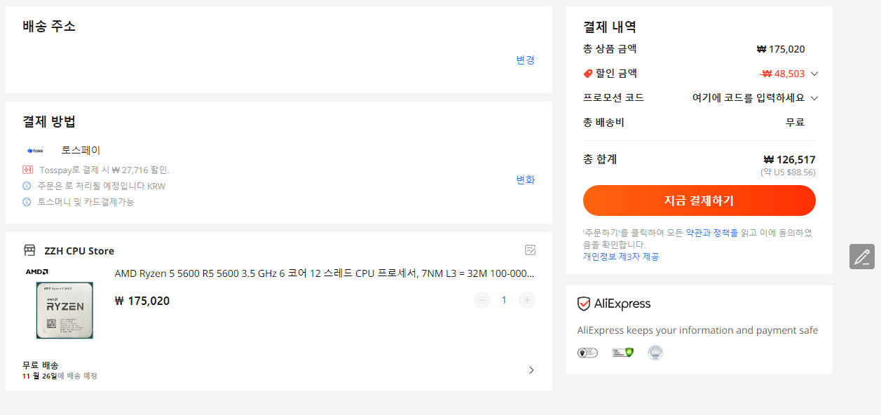 뽐뿌에서 소개한 싸게 사는 방법(토스결재시 할인, 할인코드)을 이용하여 126,517원에 아래와 같이 주문하였습니다