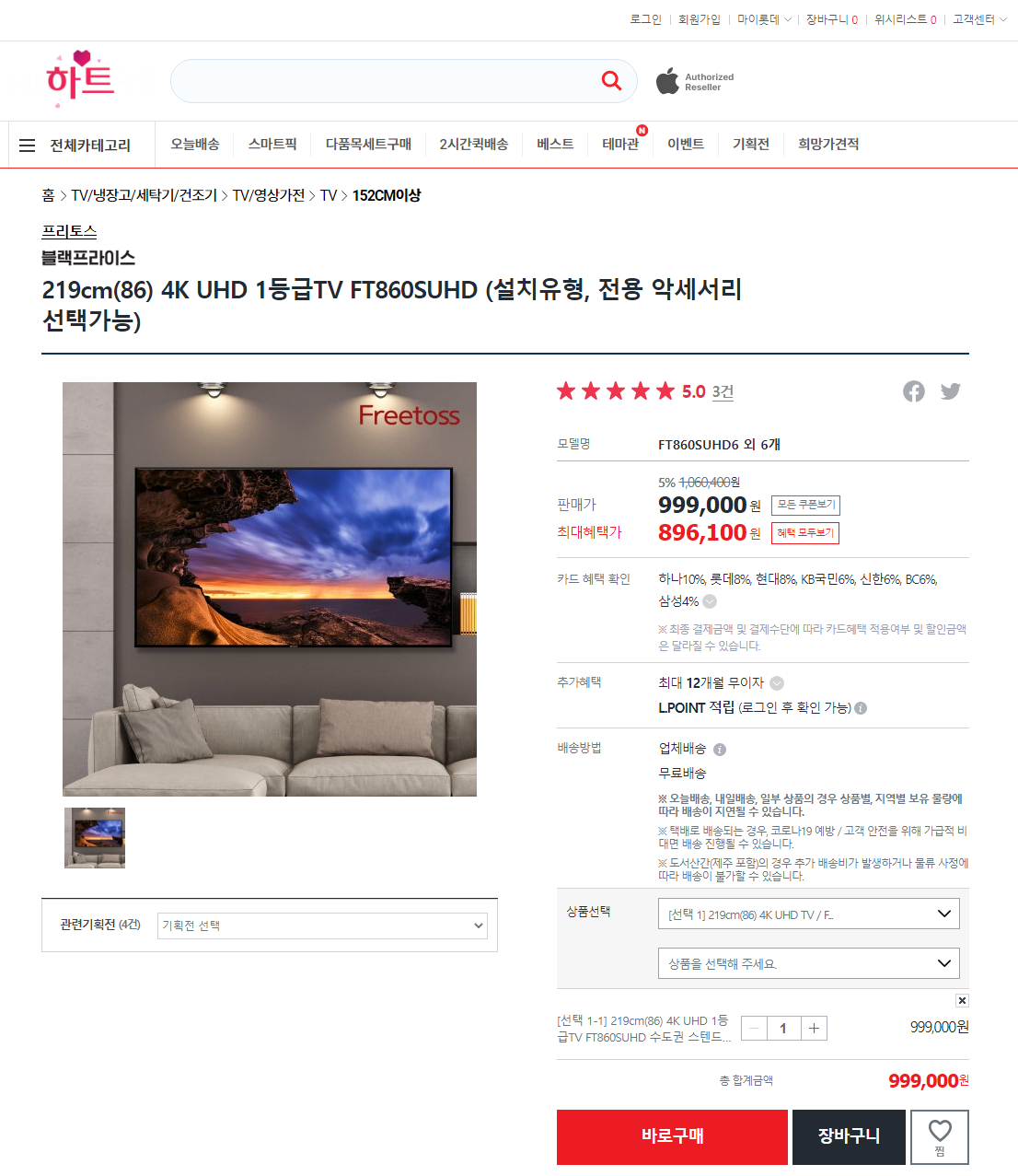 결과적으로 999000 - 99900(하나체크카드 10% 청구할인) = 899,100원에 구입하였습니다