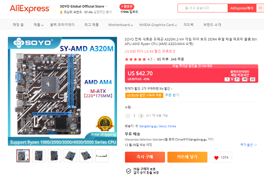 SOYO 공식판매자에게 2장에 68.08$에 구입하였습니다