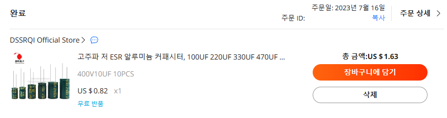 아래와 같이 동일 규격(400V, 10uF)의 콘덴서를 주문하였습니다