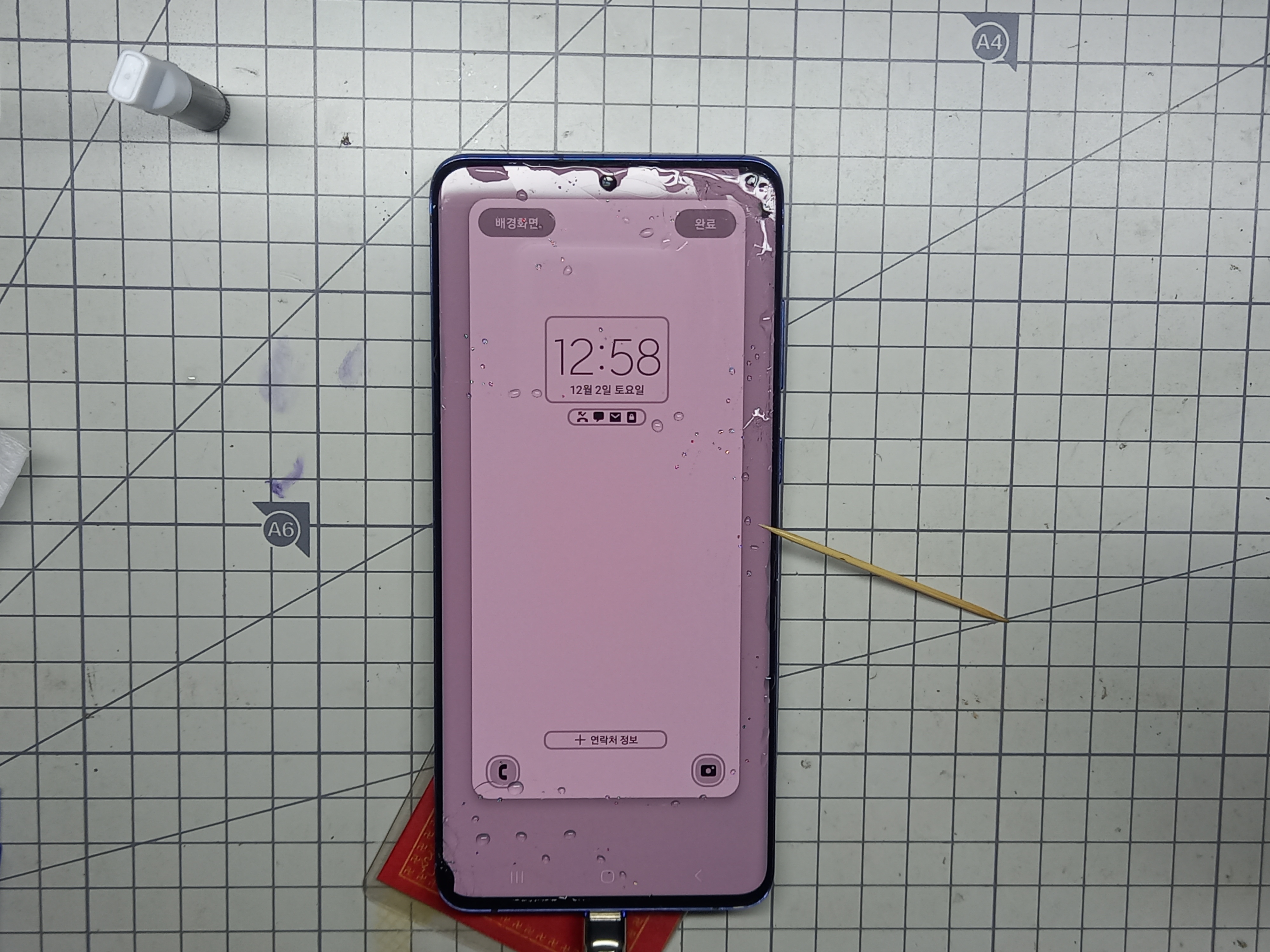 이쑤시개를 사용하여 UV 접착제가 화면유리의 깨진틈에 스며들도록 깨진 부분에 발라줍니다