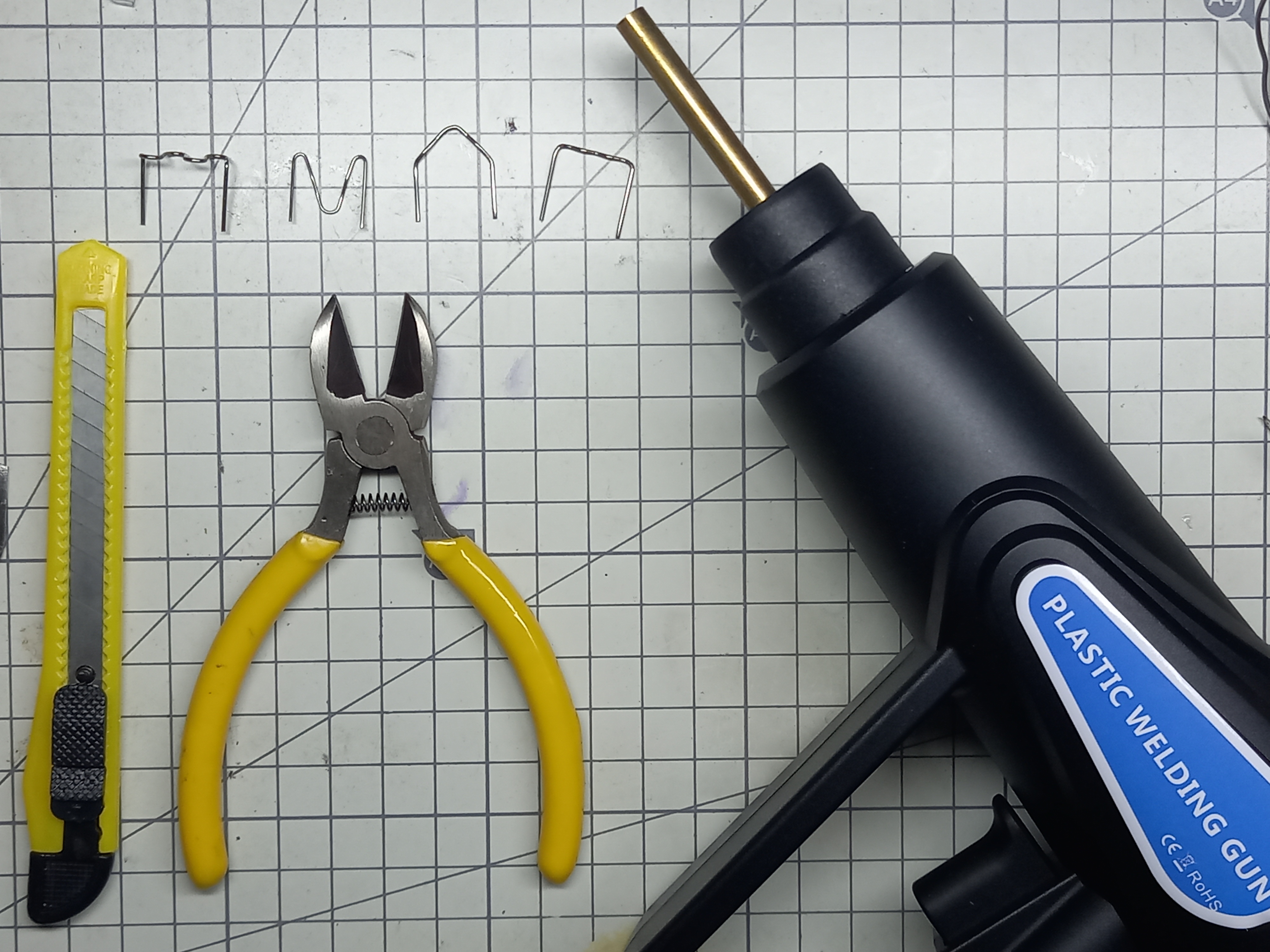 칼과 니퍼, 4종의 플라스틱 용접용 클립과 플라스틱 용접기 본체입니다