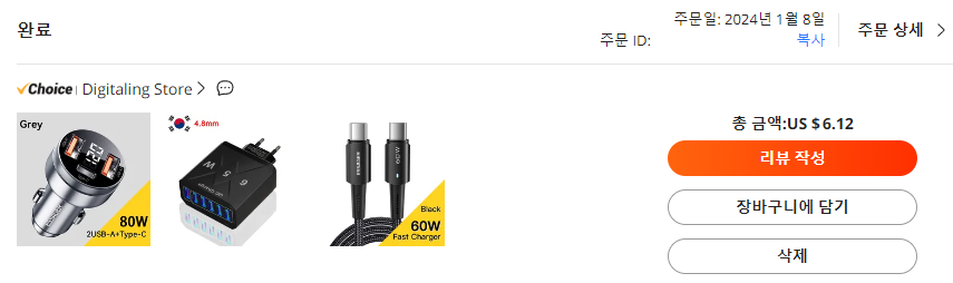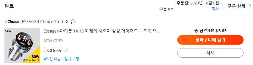 첫번째의 Essager 차량용 고속충전기는 아래 스크린샷과 같이 작년에 6.65$에 구입했던 제품입니다
