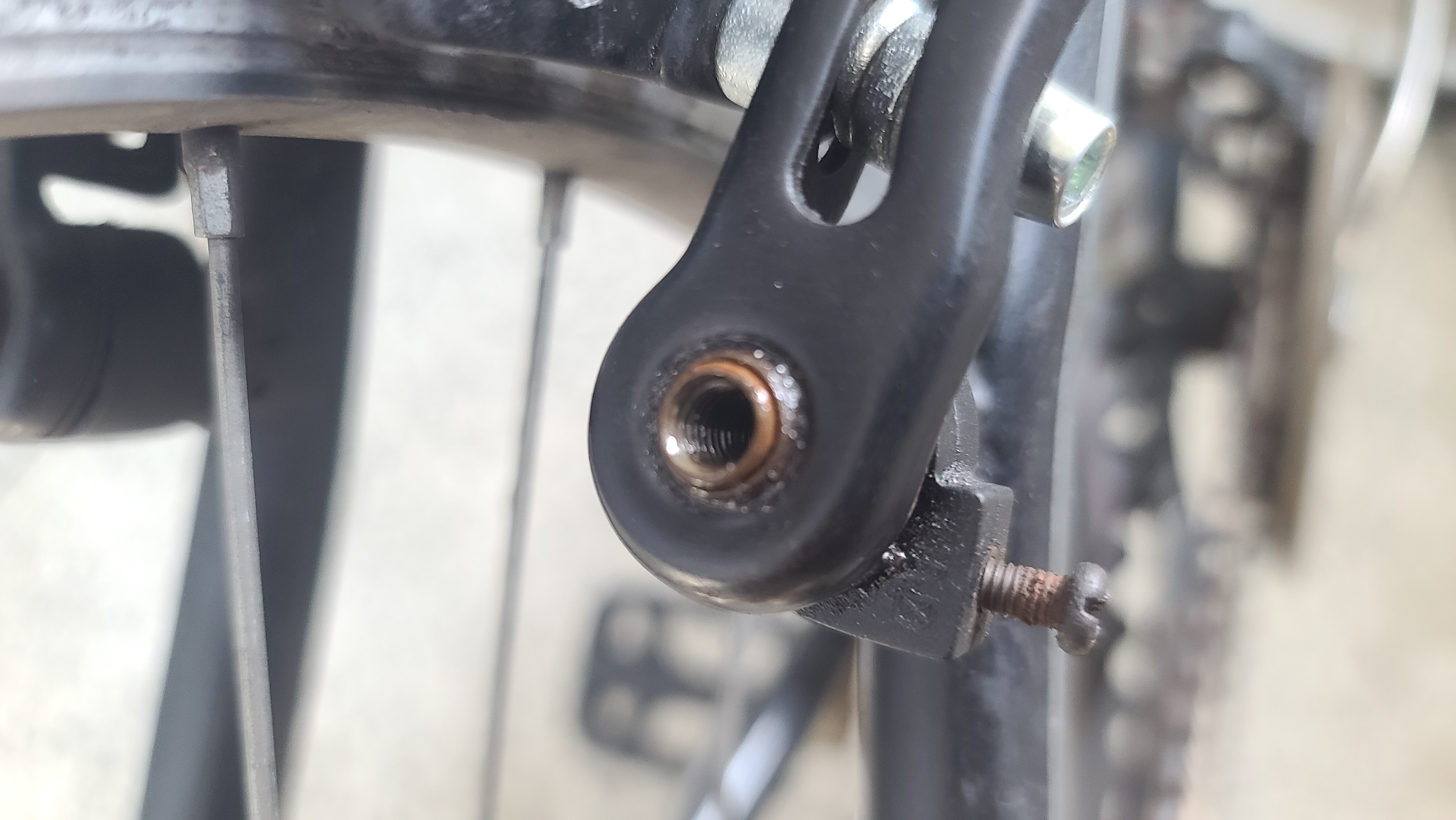 아래 사진과 같이 V 브레이크 고정나사와 V 브레이크를 고정하는 자전거 프레임에 녹이 보입니다