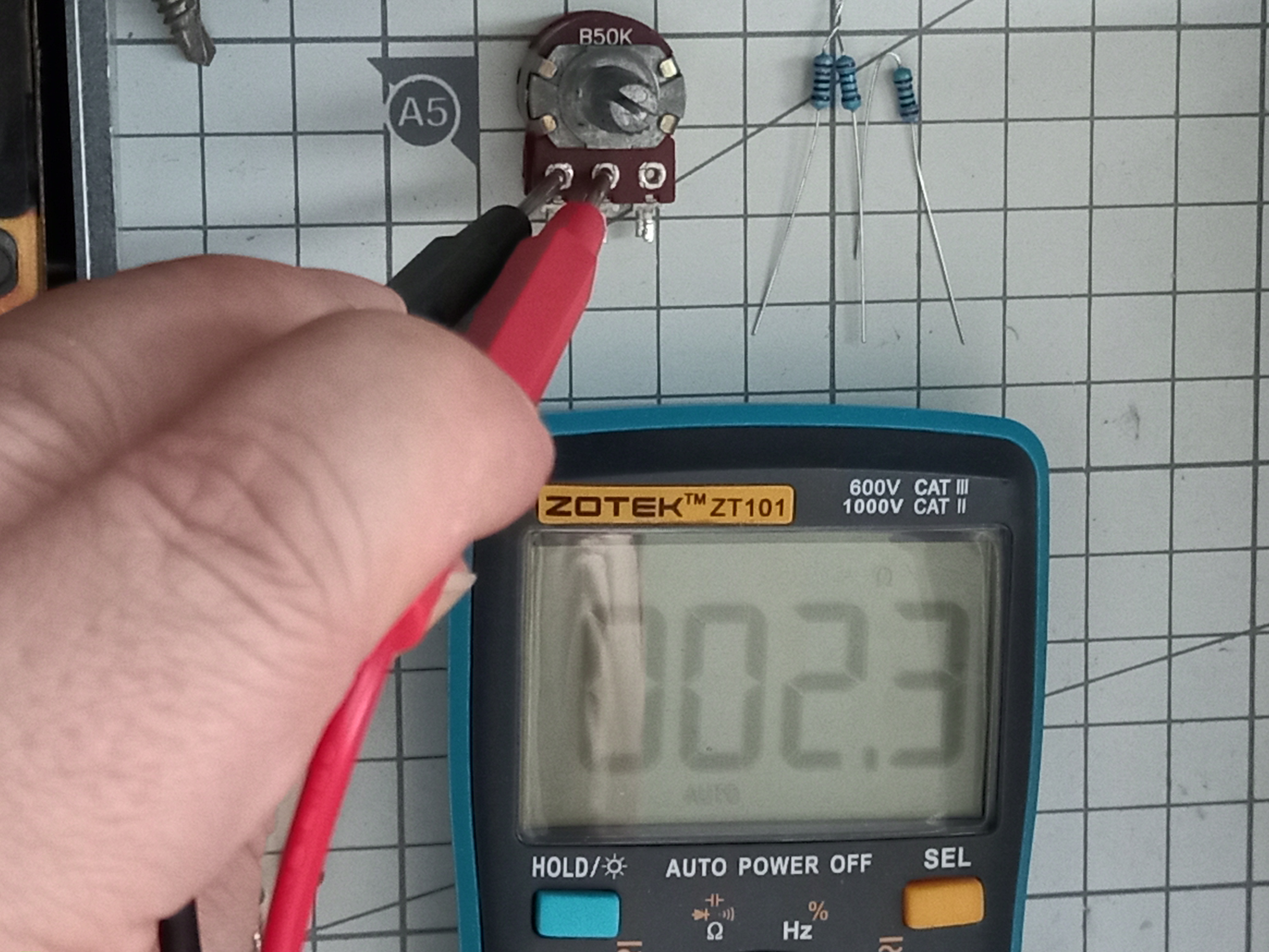 오른쪽 단자와 가운데 단자를 측정하면 50k옴에 가까운 값이 나오겠네요