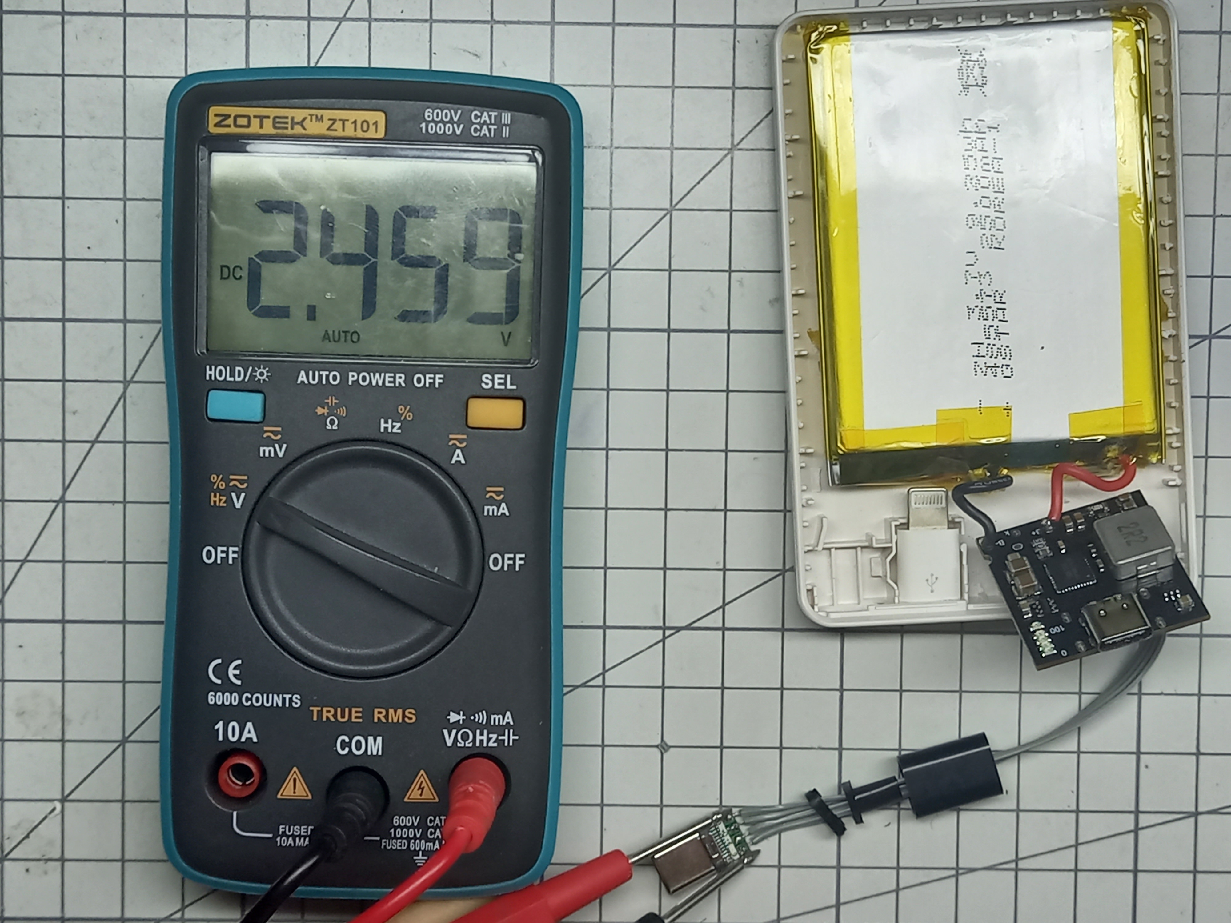 테스트를 위해 휴대폰 충전기를 PCB의 USB C 단자에 연결해서