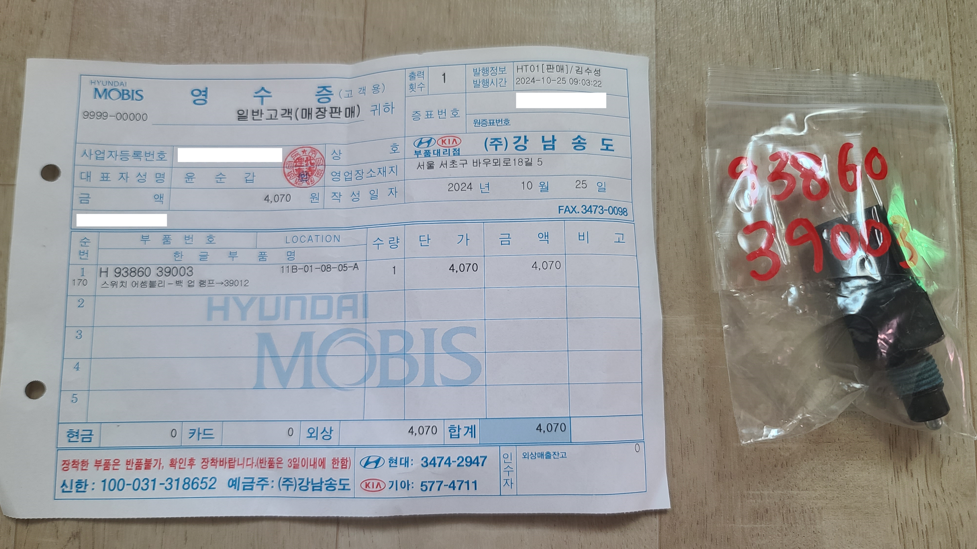 부품번호는 H 93860 39003 이고 가격은 4070원입니다