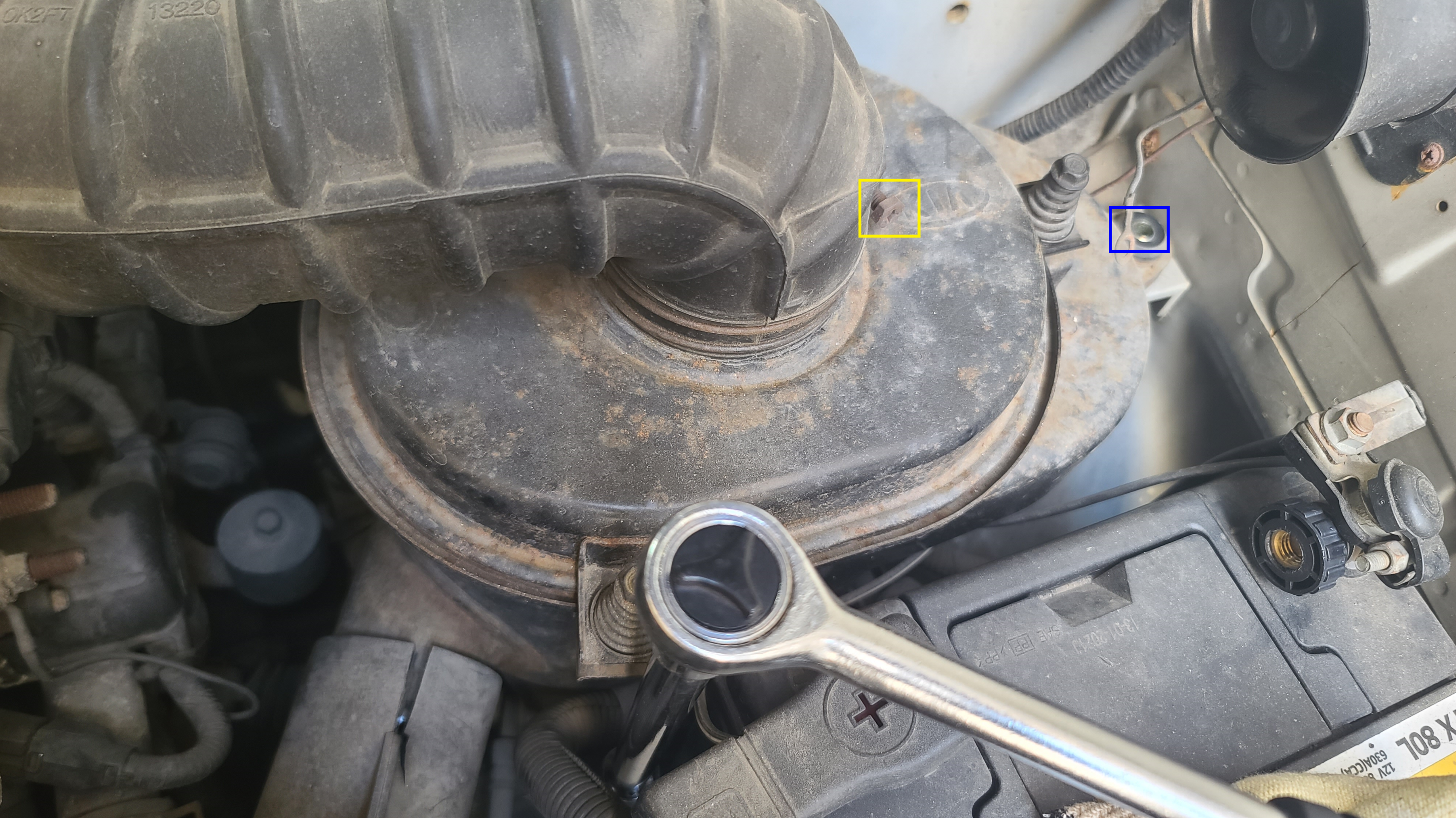 공기필터를 들어내려면 12mm 복스로 2개의 볼트와 1개의 너트, 합쳐서 총 3곳 풀어줍니다
