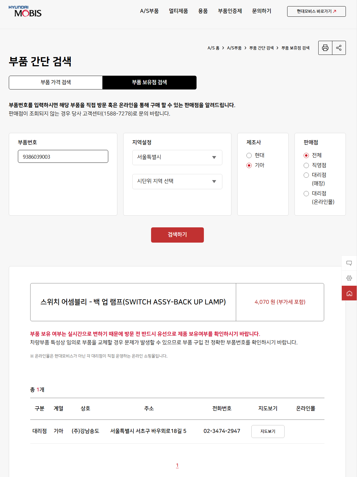 찾아진 부품번호를 누르고 지역을 설정하여 검색하면