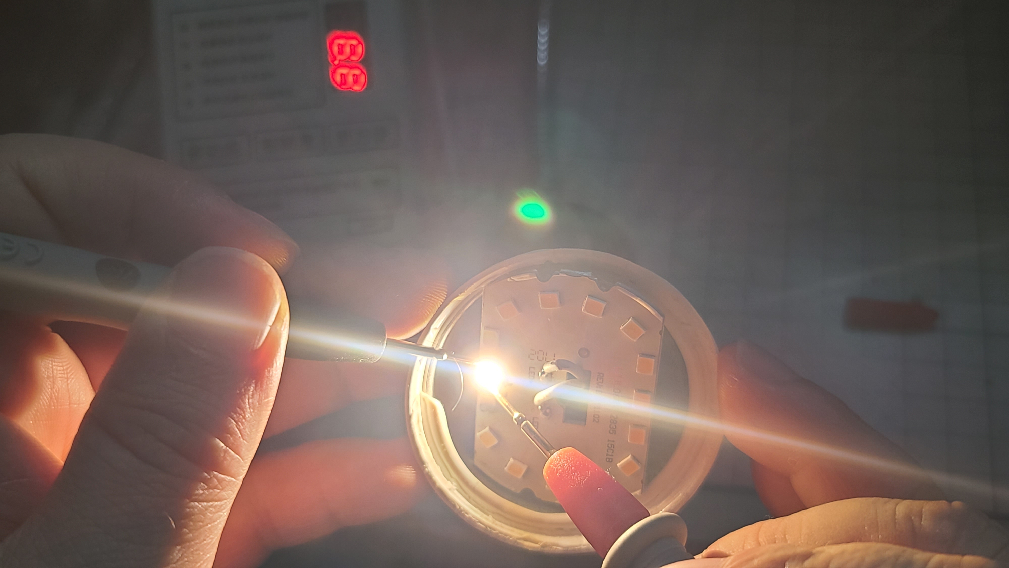 LED 기판을 올려 놓고 계속 고장난 LED를 건드려 보면서 확인하니