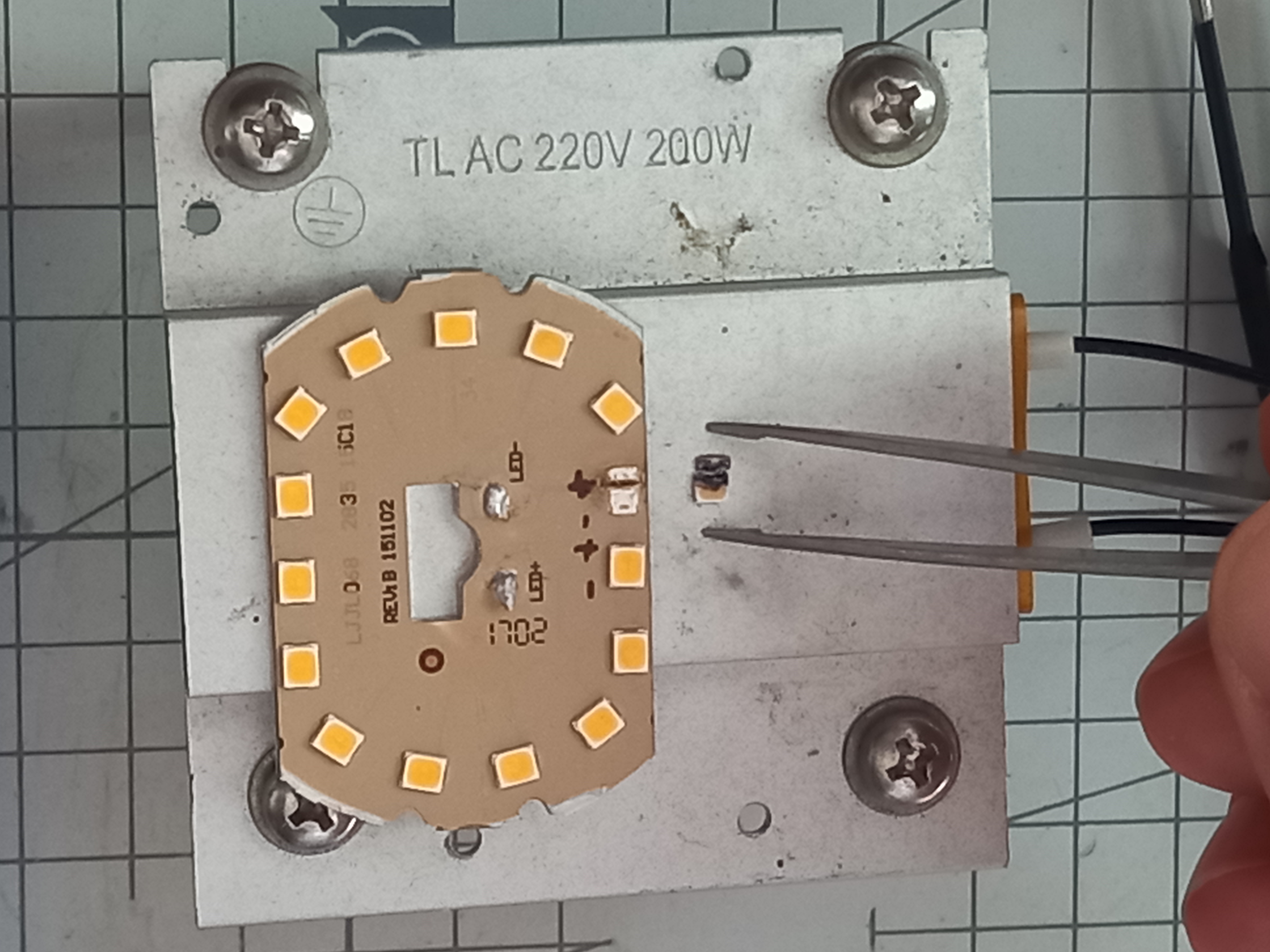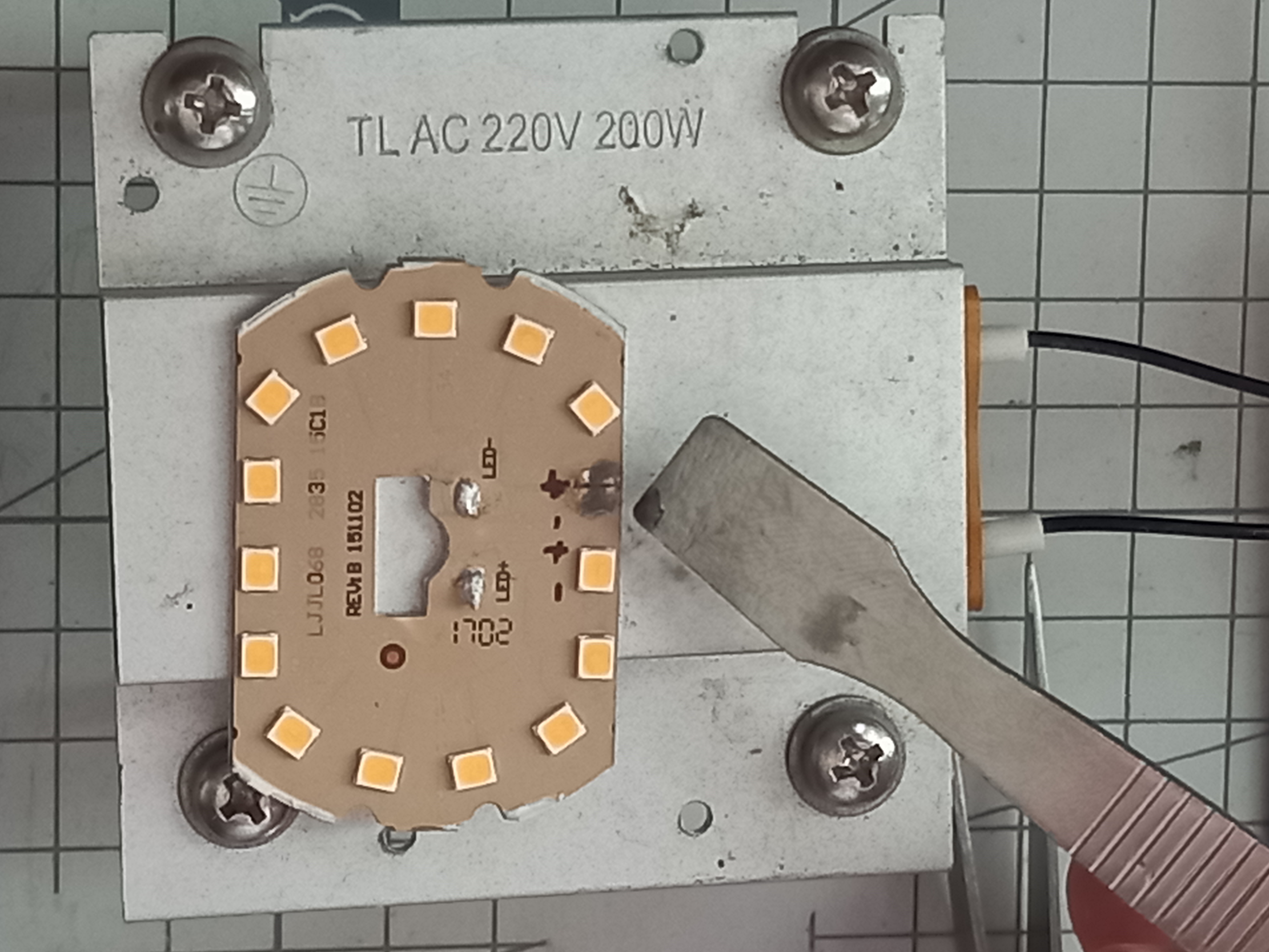 우선 인두기를 사용하여 LED기판에 연결된 전선 2개에 극성 표시를 해준 후