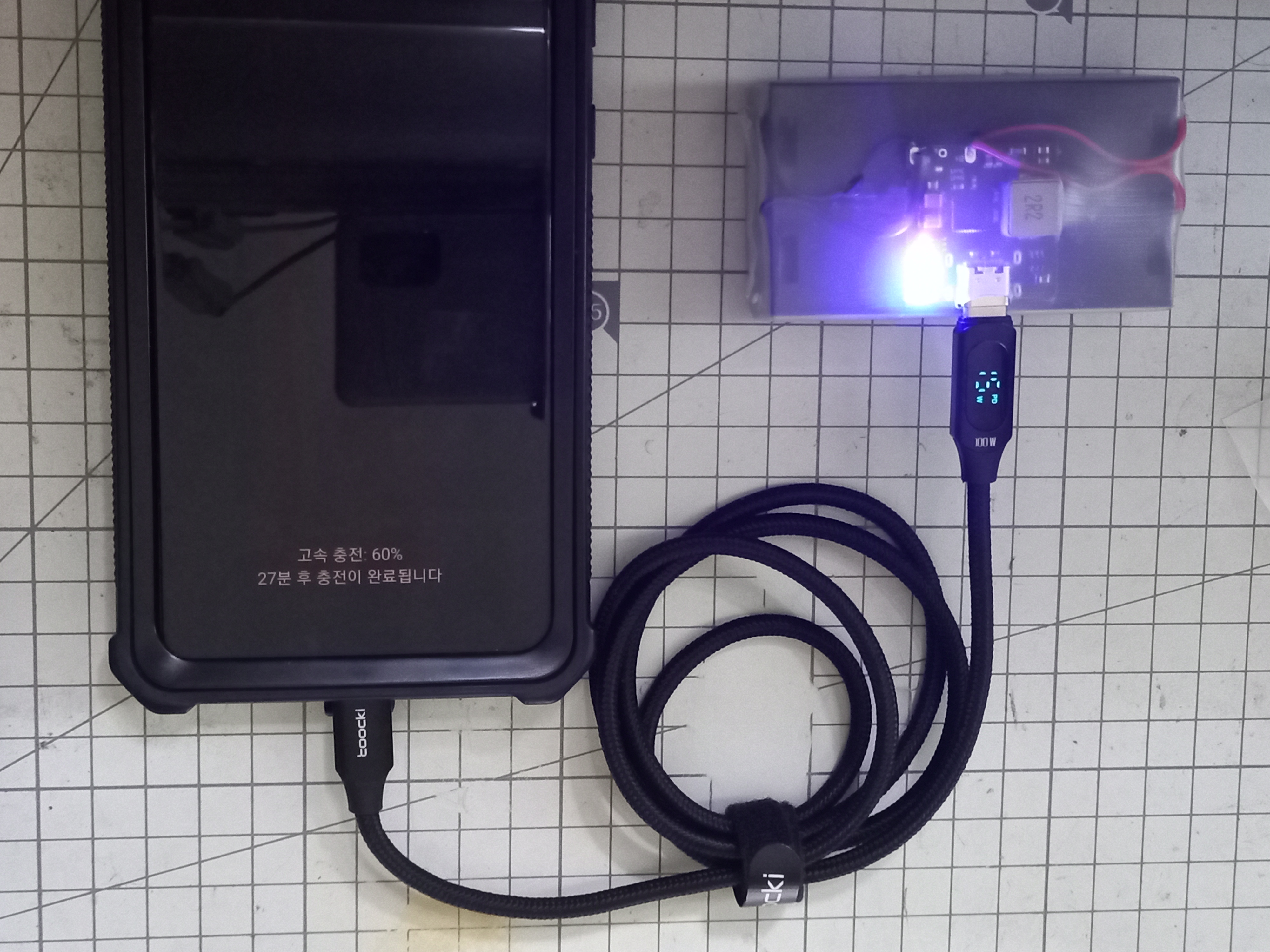 아래 사진의 충전 케이블이 측정한 충전와트수 15W로 고속충전이 잘 동작합니다