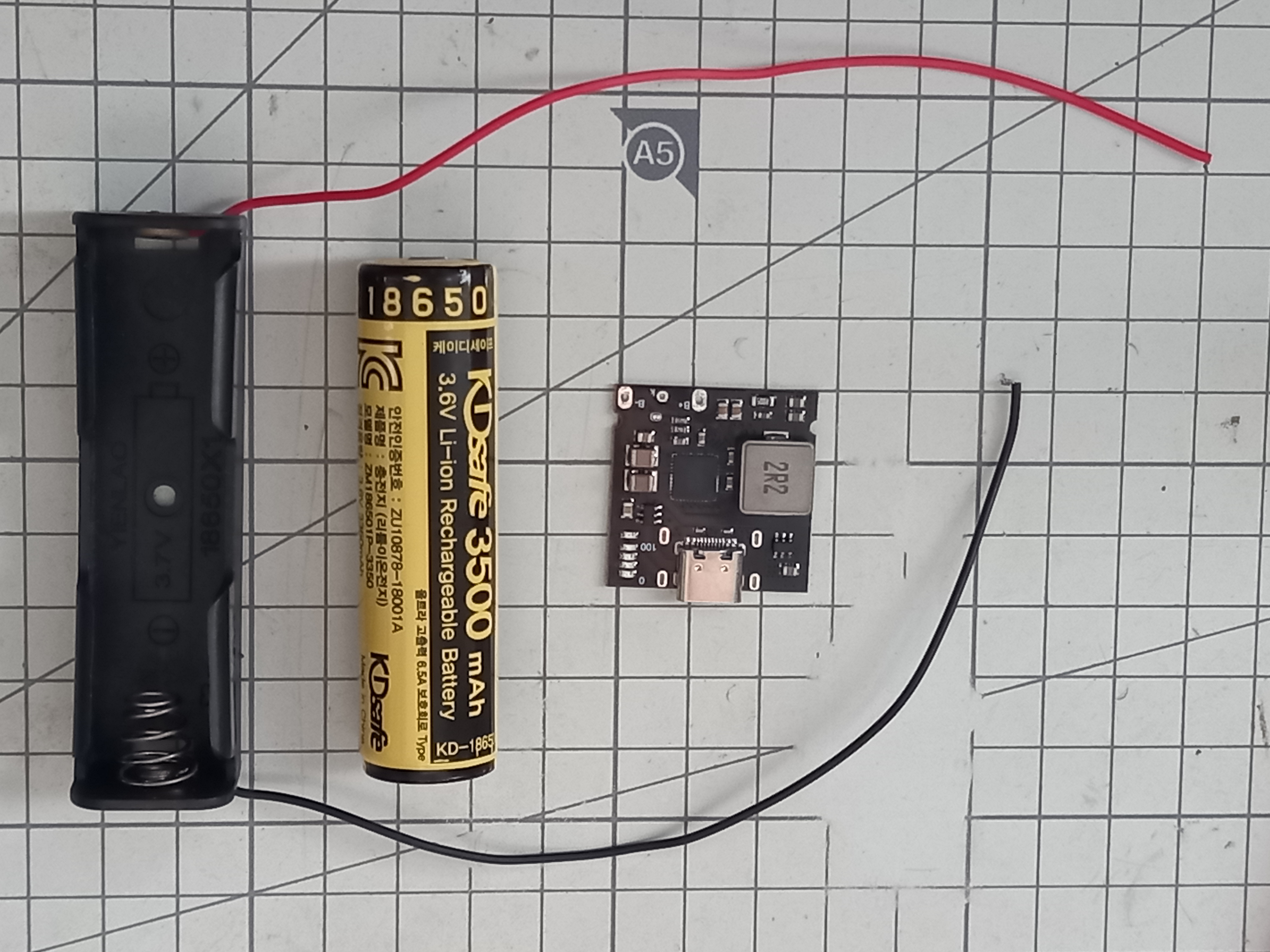 왼쪽부터 18650 배터리 홀더(2개), 18650 배터리(2개), 리튬이온 배터리 충전 및 스마트폰 고속 충전용 보드 입니다