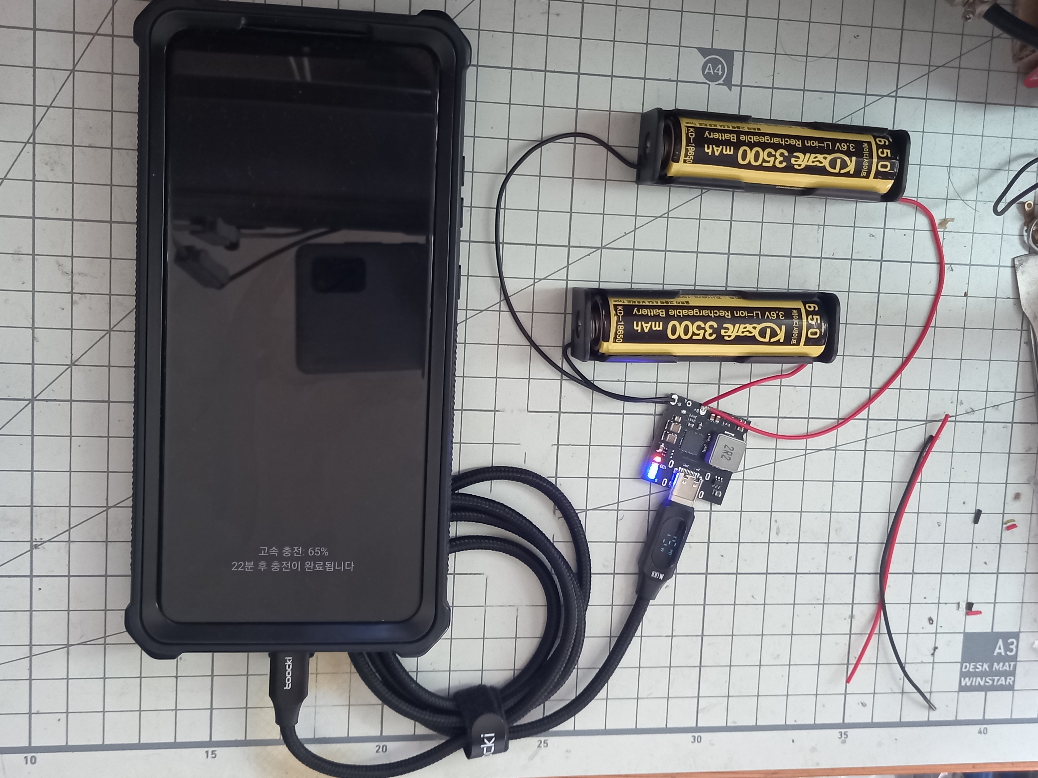 충전된 18650 배터리로 교체하면 바로 또 스마트폰을 충전할 수 있는