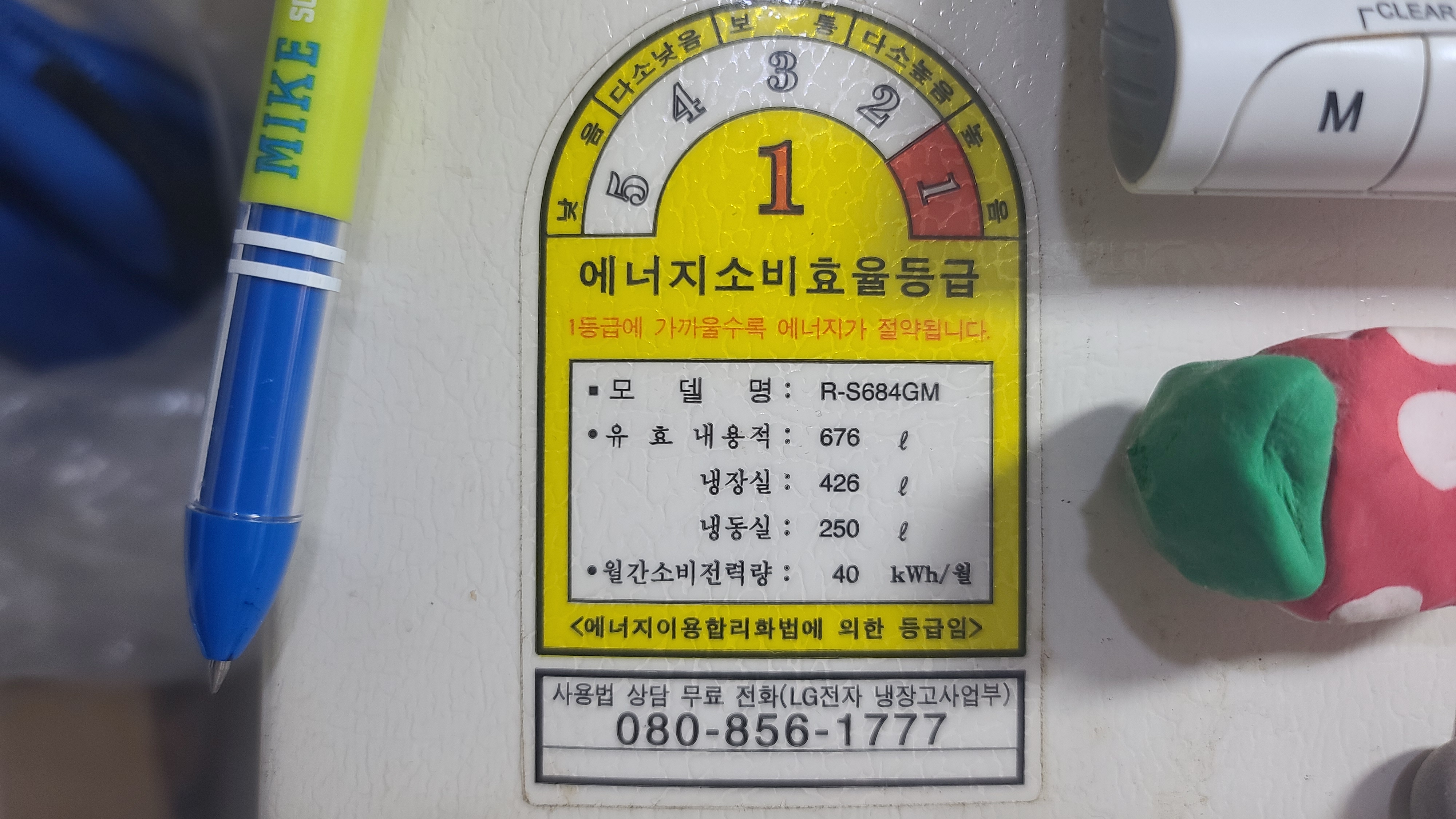 아래 사진은 냉장고의 모델명과 에너지효율등급이 표시된 스티커입니다