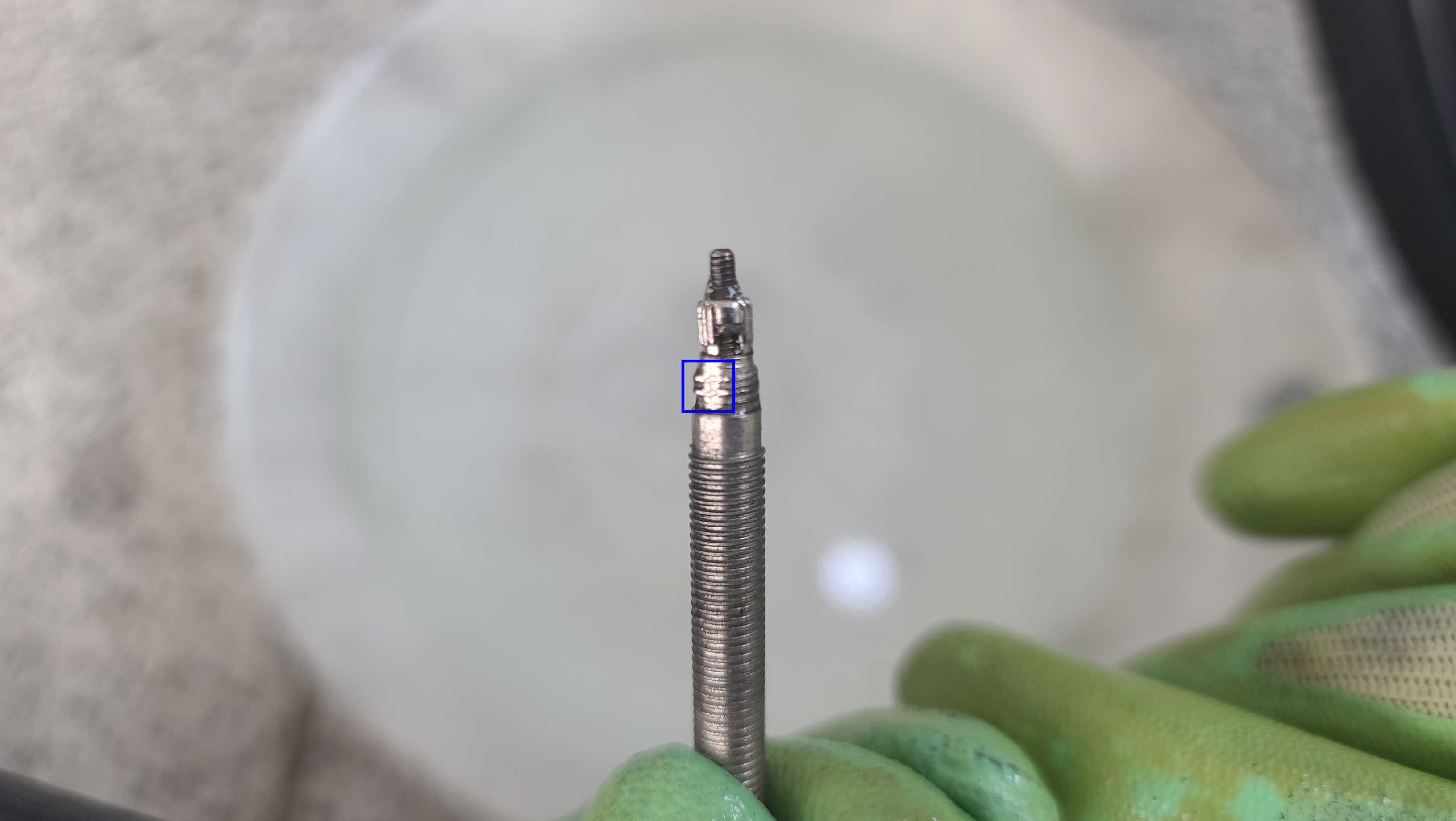 프레스타 밸브의 틈 왼쪽 편에 공기방울이 1개 맺혀 있습니다