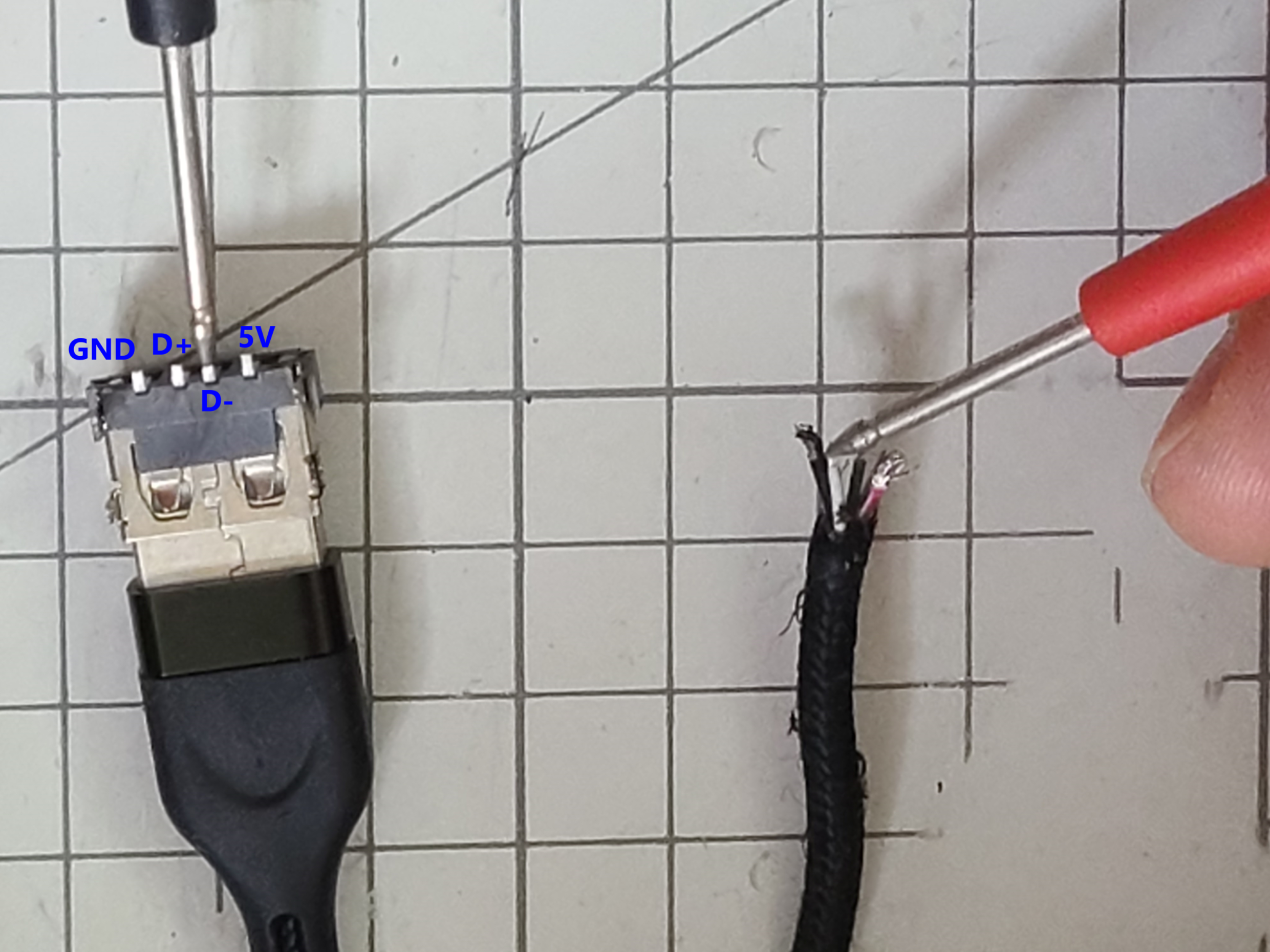 충전케이블의 USB-A 단자와 케이블 간의 배선을 확인합니다