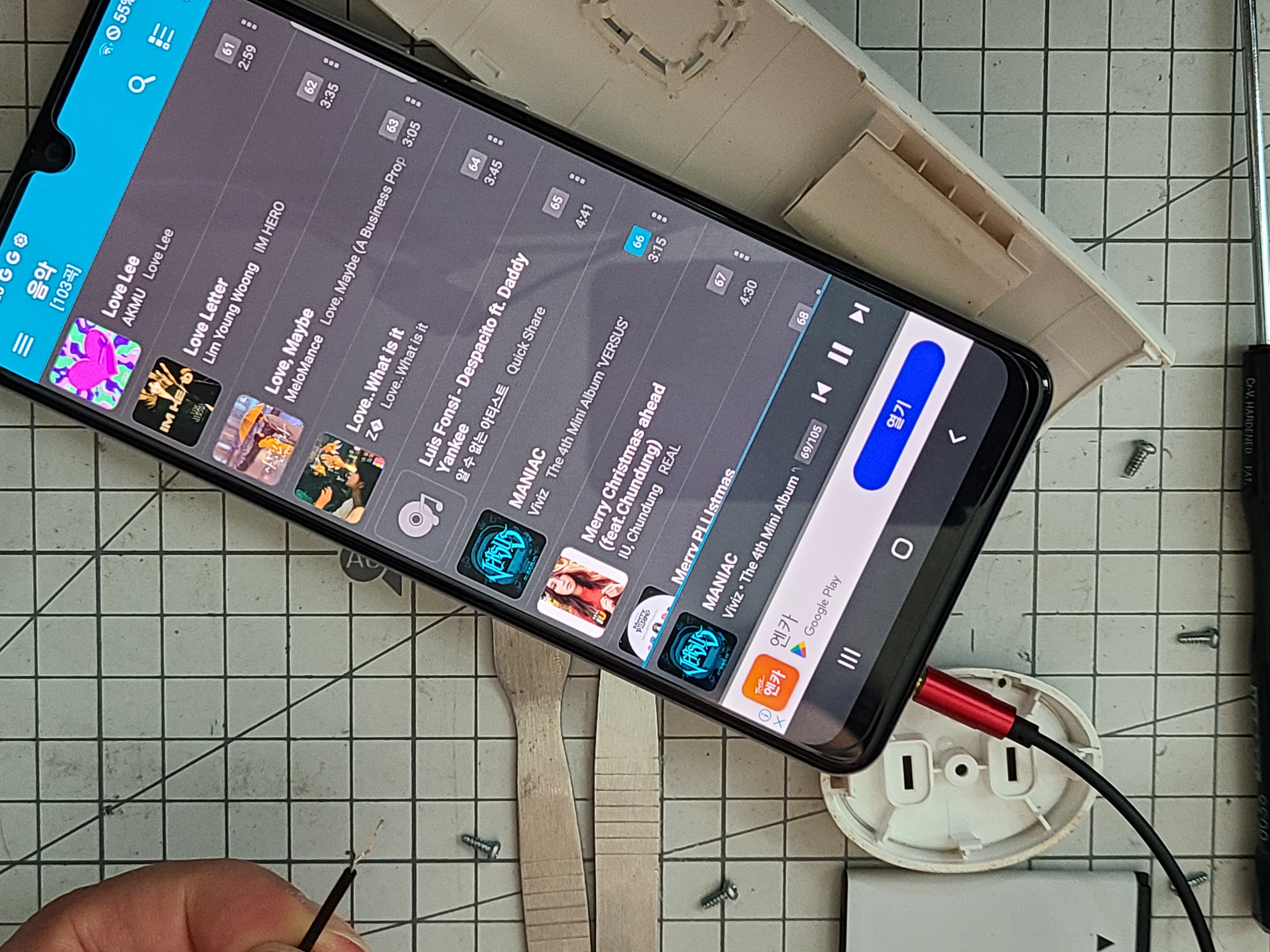 스마트폰에 제작용 3.5mm 잭을 연결하여 스피커의 단자에 접촉시켜 봅니다