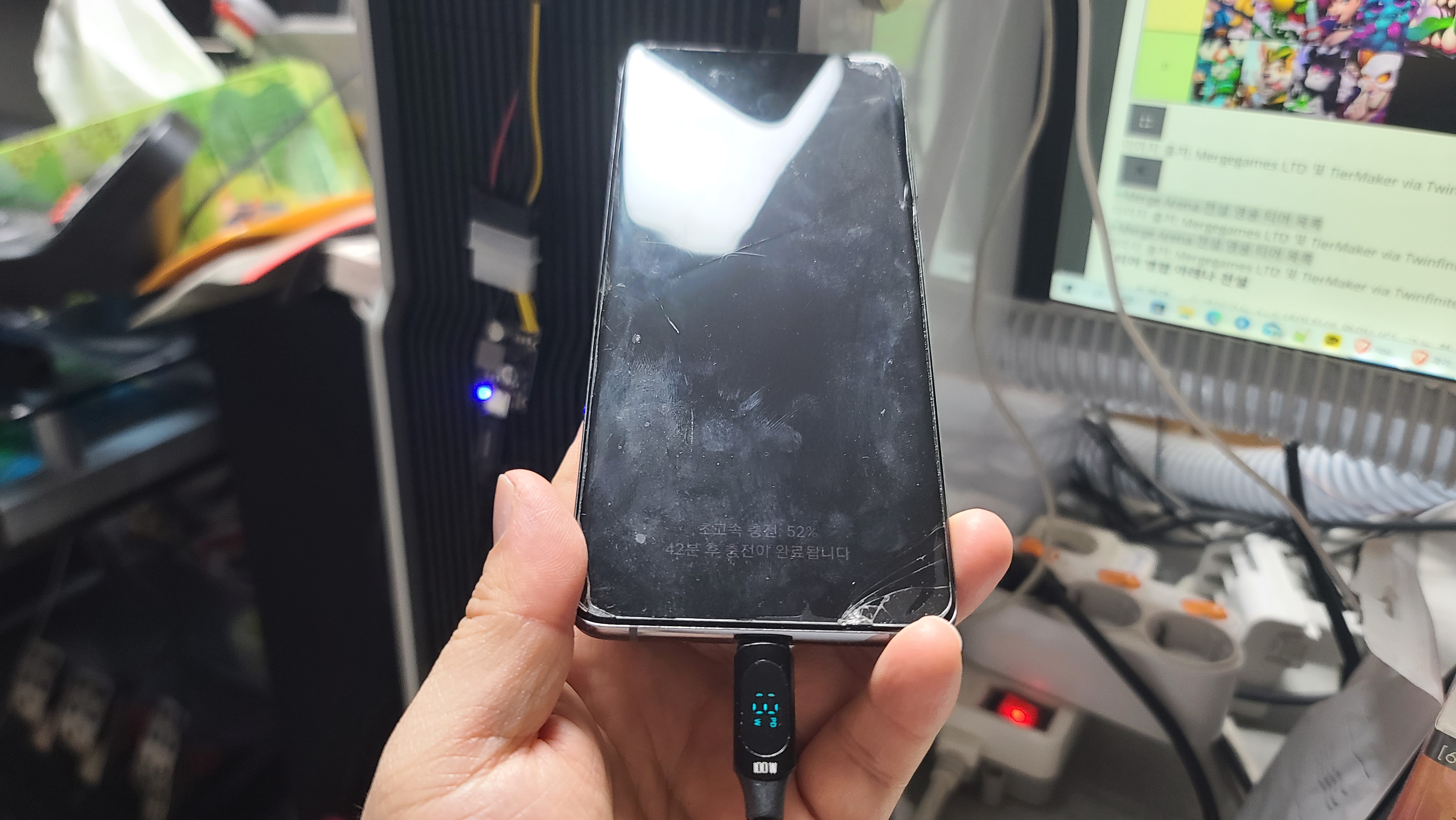 컴퓨터 파워 케이블을 연결하면 배터리가 떨어진 스마트폰을 컴퓨터를 사용하는 중에