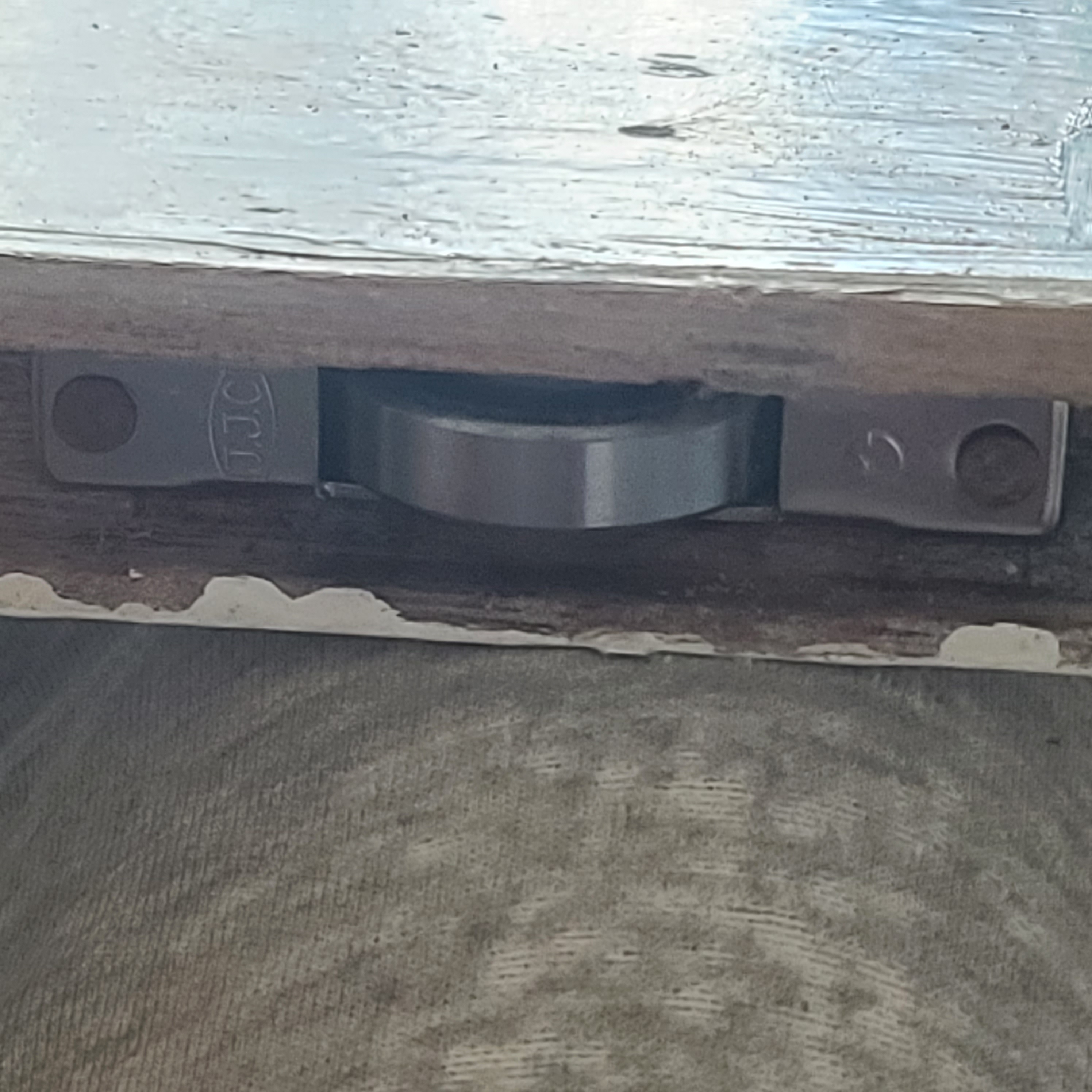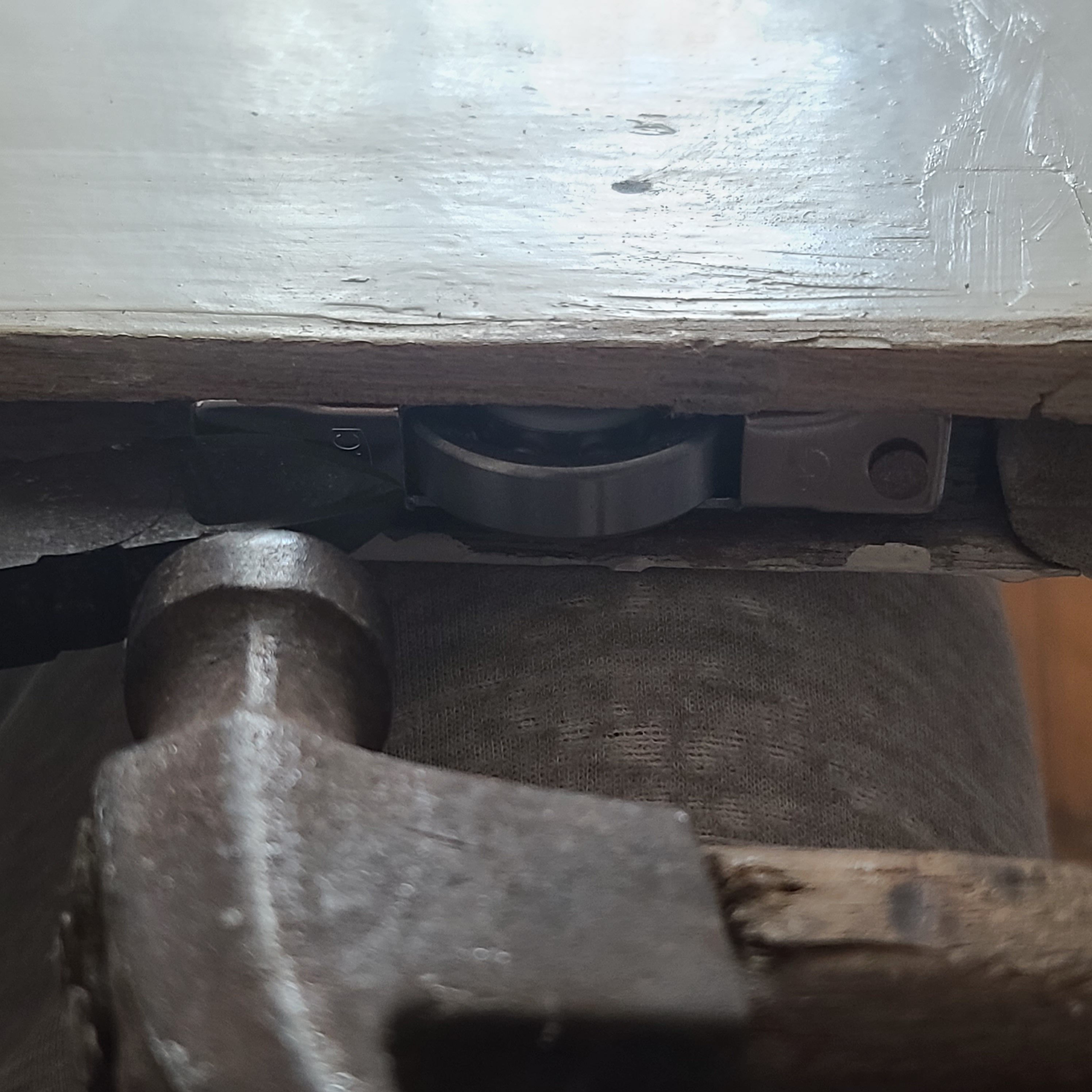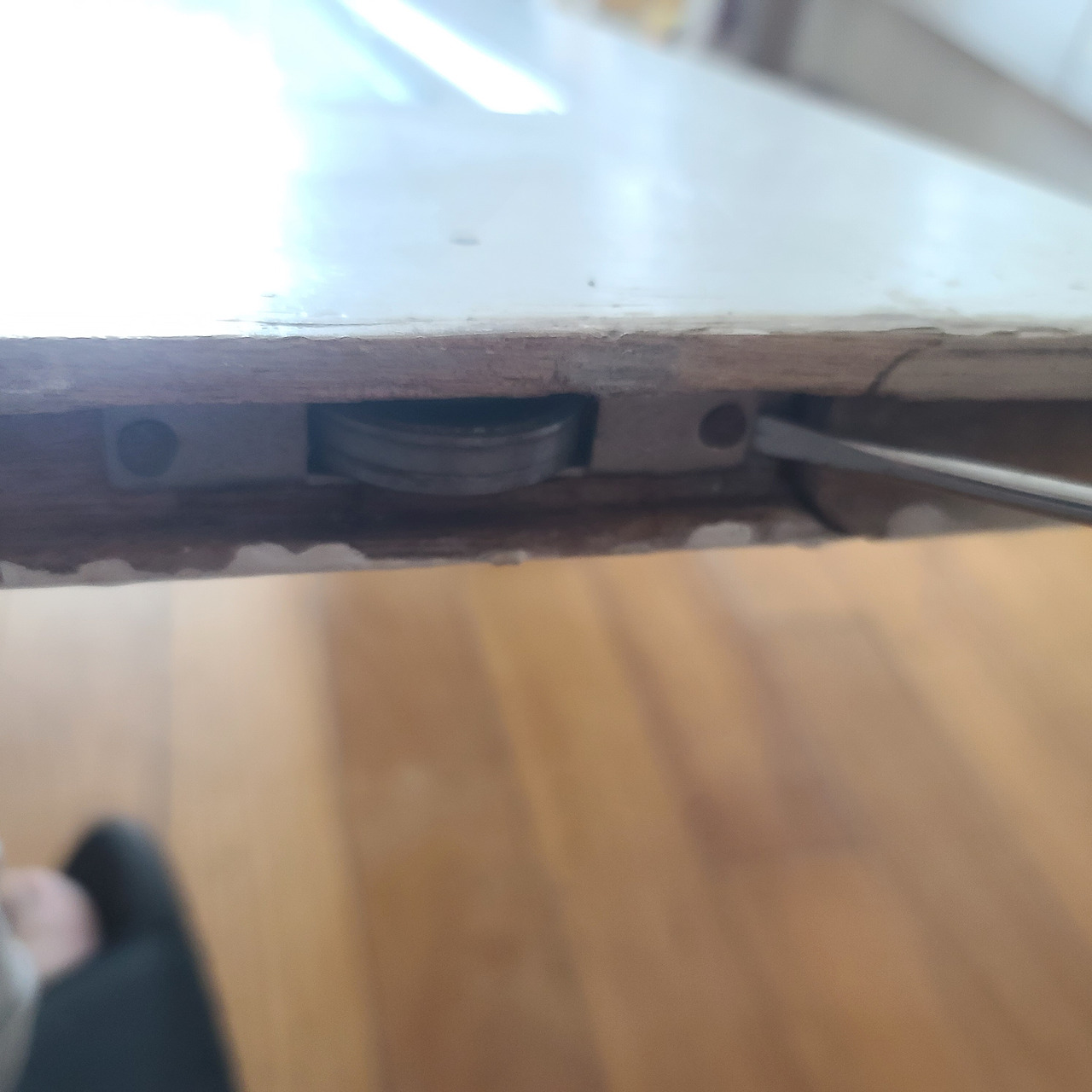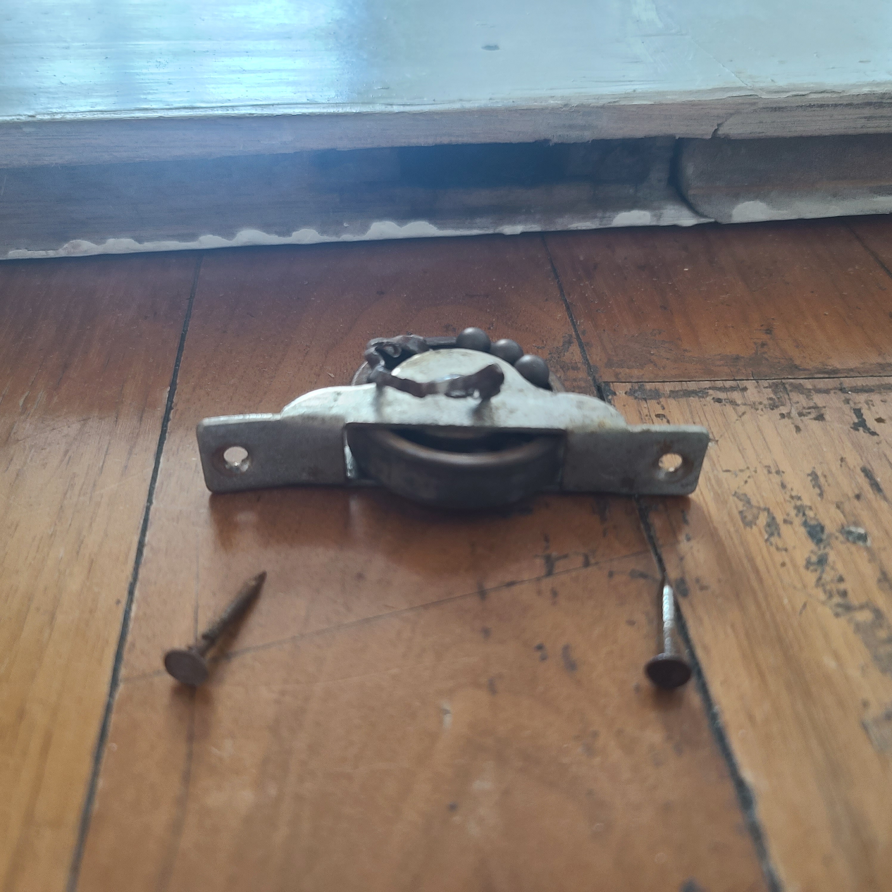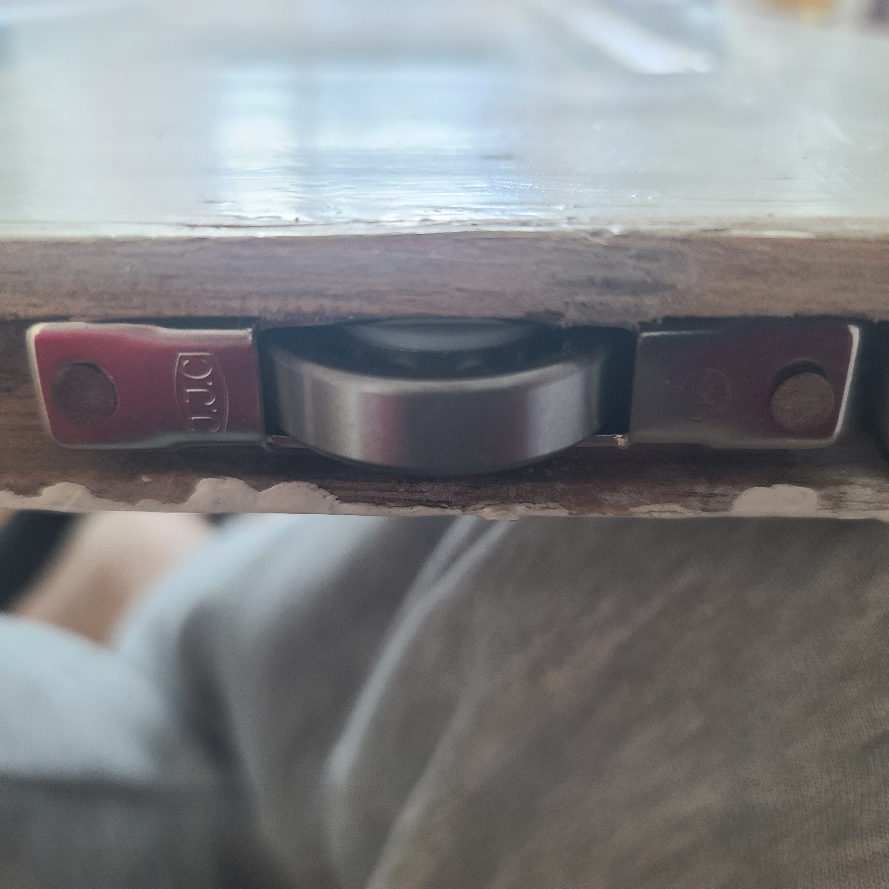 고장이 없는 호차는 멀티구리스를 바르고 1개의 호차만 교체하여 수리한 나무창문을